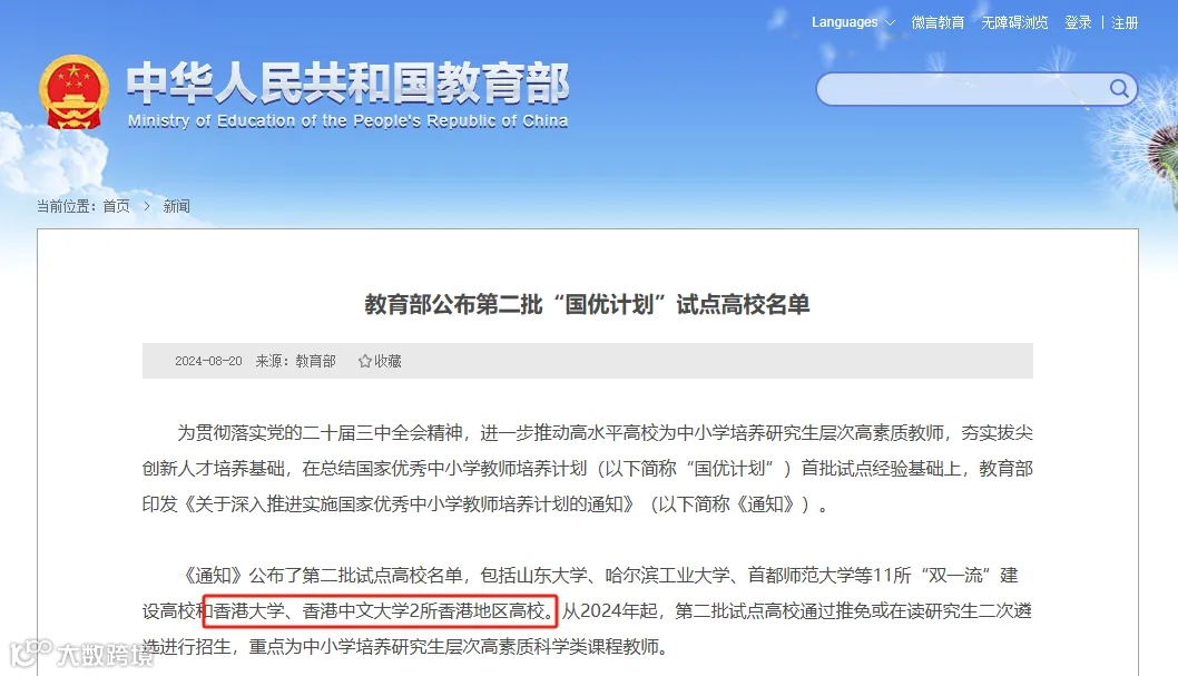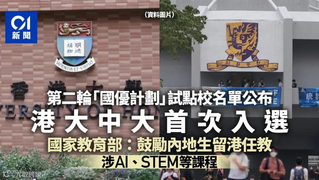 值得关注的是,这是香港地区高校首次加入“国优计划”试点,入选院校为香港大学与香港中文大学。