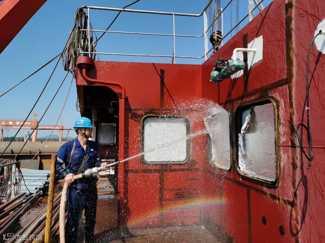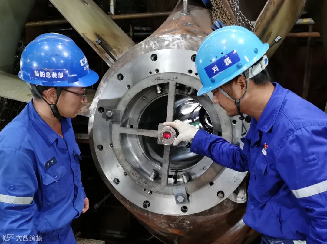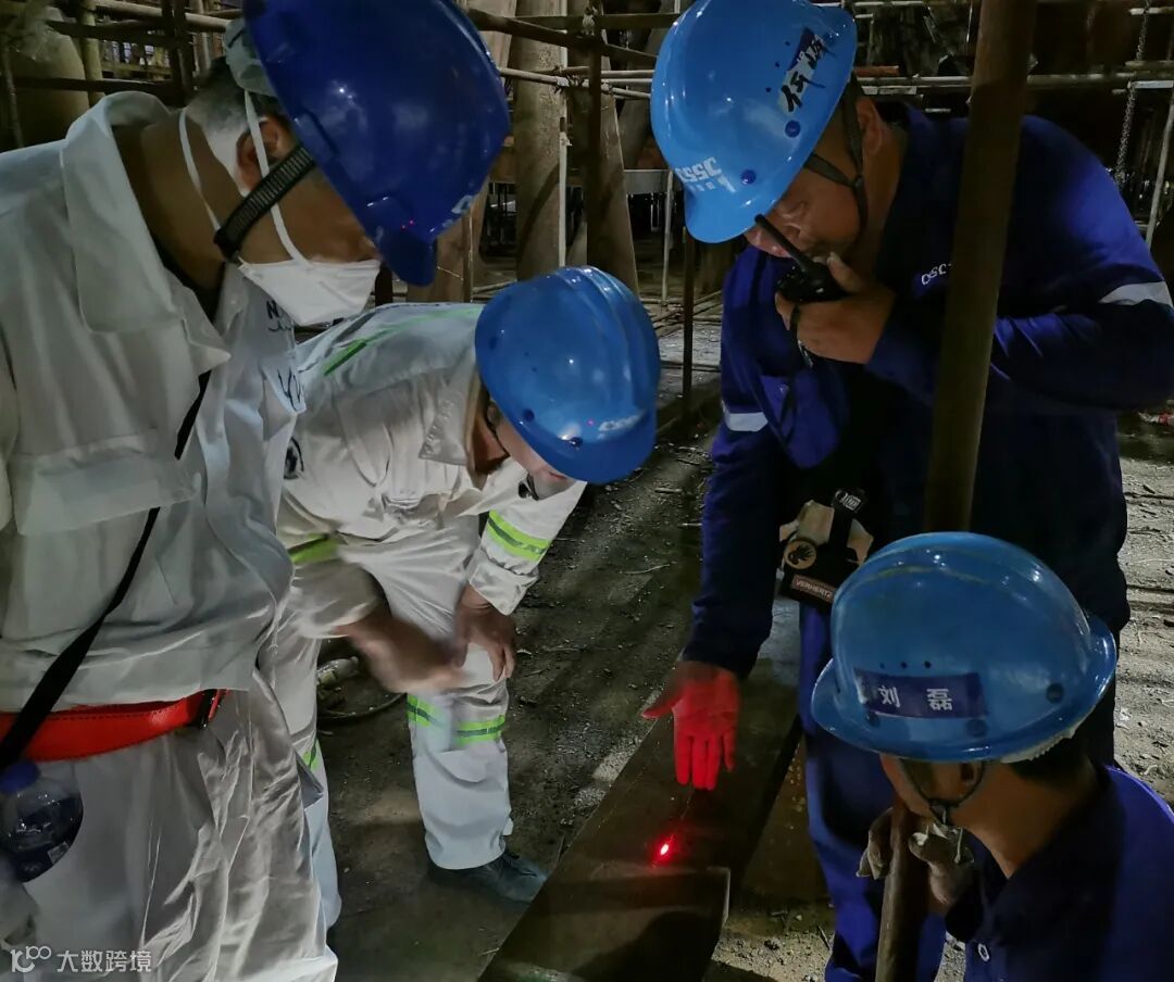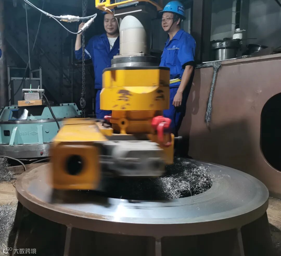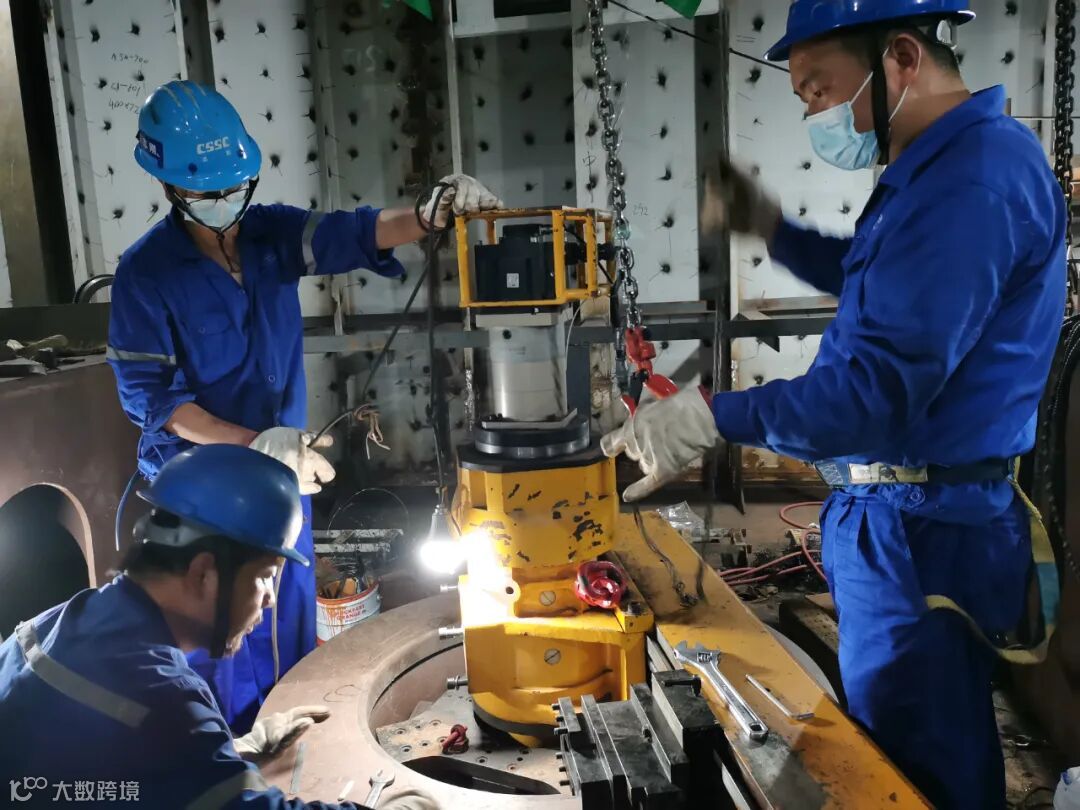 △高刚、段志刚、尹恒进行舵系镗孔施工