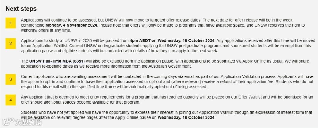 2024年10月8日,新南威尔士大学发布了重要公告,宣布2025年入学申请将于2024年10月16日(下周三)下午4点暂停!