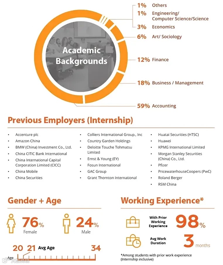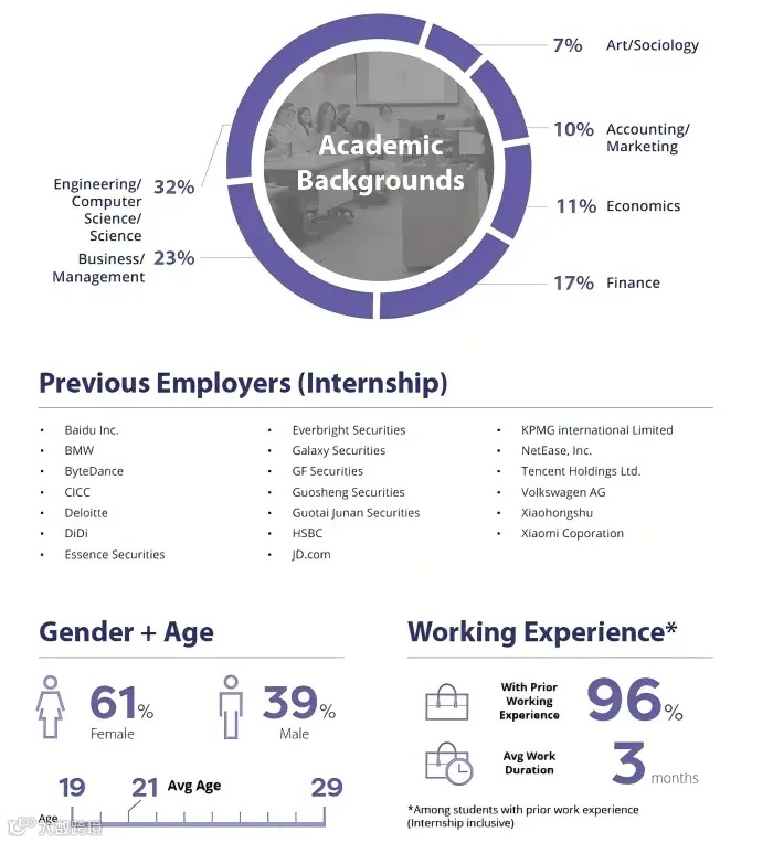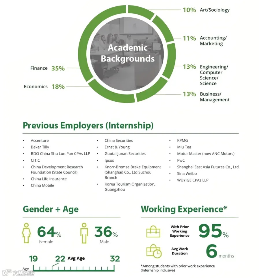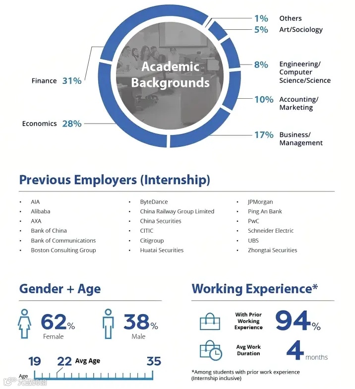 作为商学院的新兴项目,气候治理与风险管理硕士的录取学生以商科背景为主,其中金融背景占35%、经济背景18%、商业/管理背景13%、会计/市场营销背景11%。此外,该专业也接收文科和环境相关专业的跨专业申请者。