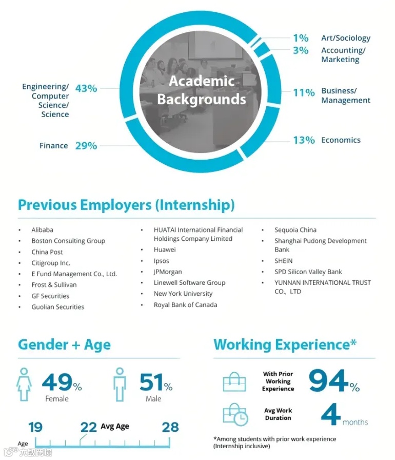 金融科技硕士倾向录取理工科背景学生,占比高达43%;其次是金融背景29%,经济背景13%,商业/管理背景11%,会计/市场营销背景3%。理工科和金融背景的申请者因定量分析能力强,更符合该专业需求。
