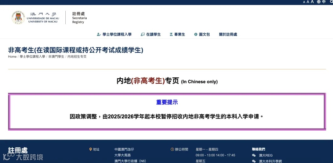 2025/2026学年起澳大暂停招收内地非高考学生的本科入学申请