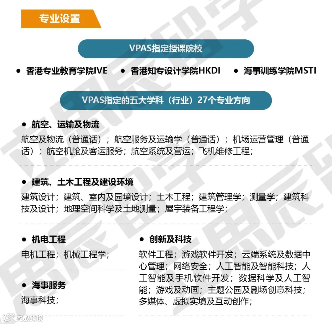 “VPAS”计划是香港特区政府推出吸纳职专技术人才的措施,以应对香港经济转型和科技急速发展下的迫切人力需求。该计划将试行2年,旨在吸引更多非本地学生 (包括内地及其他国家/地区的学生) 来港就读政府指定行业的香港职业训练局 (VTC) 全日制高级文凭 (两年制) 课程,并鼓励学生毕业后留港从事与其专业相关的工作,投身成为重要行业的技术型人才。