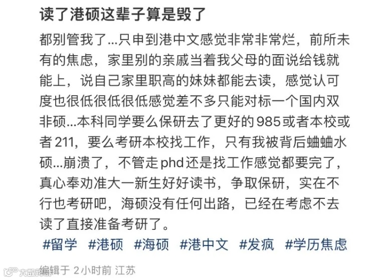 “港硕只是被一些人影响了名声,国内硕和境外硕的区别你完全不了解,出路那么差怎么会那么多人去?”