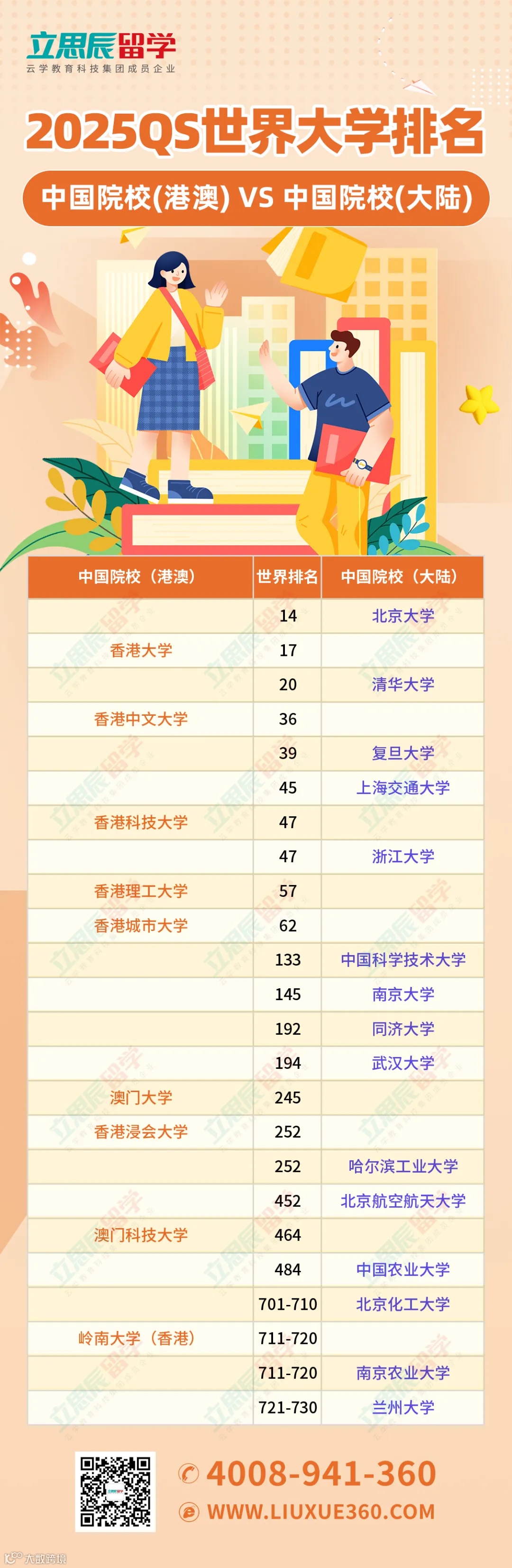 2025年QS排名中,香港6所大学的排名全部较去年上升,其中3所大学位列全球前50名。