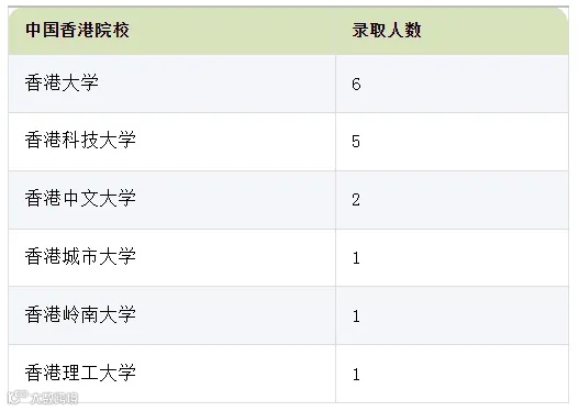 香港大学有6名学生被录用,香港科技大学有5名学生被录取,香港中文大学也有2人成功入选。