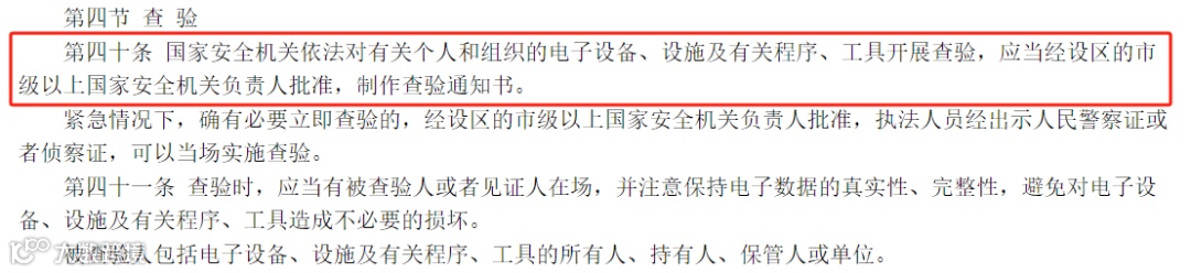 这样看来,这项规定的检查权基于国内安全防范:执法人员需得到上级批准并出示检查通知书或证件,才能检查电子设备。在紧急情况下,执法人员可以直接进行检查。目的是为了对国家安全防范,强调对潜在安全威胁的预防和打击。