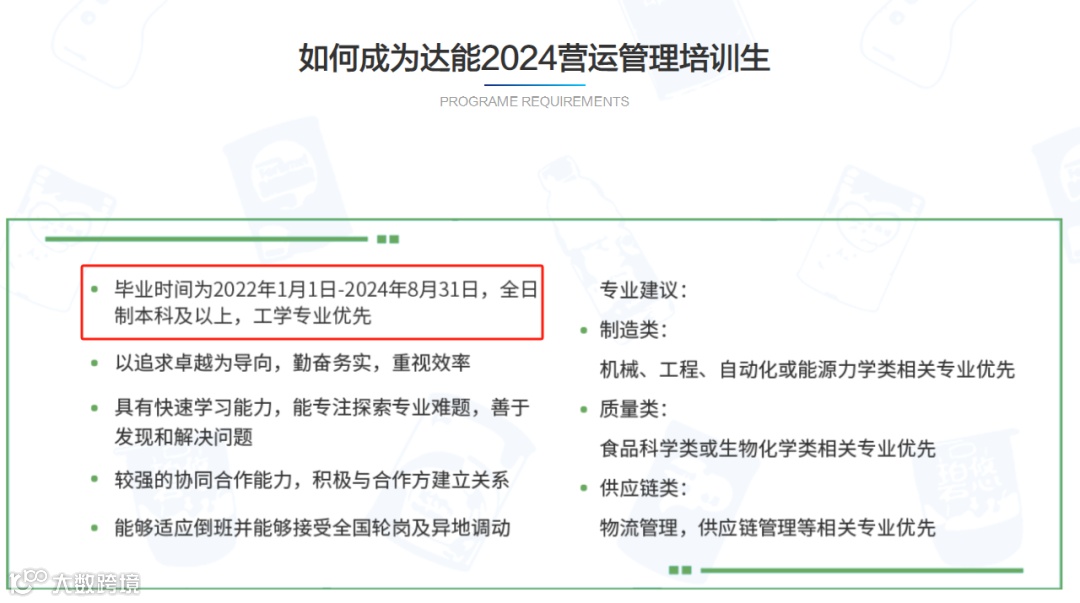 比如:宝洁24年校招,面向22年1月-24年12月毕业的同学;达能管培生岗位,接受24届或毕业2年内的往届生;