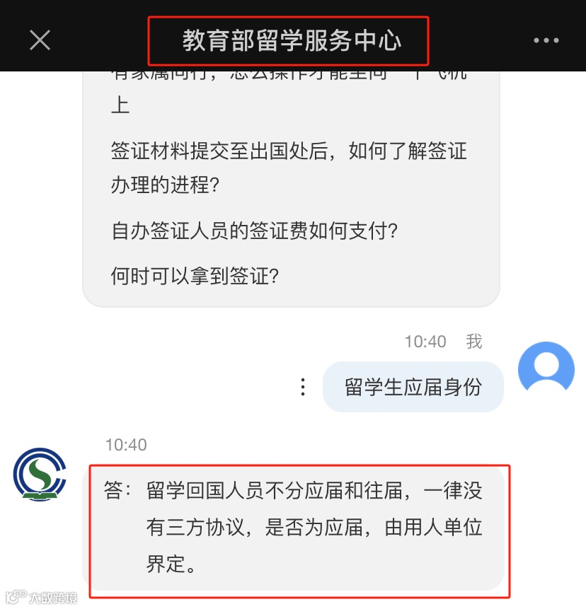 依据教育部留学服务中心规定,留学回国人员不分应届生和往届生,和国内应届高校毕业生不同留学生一律没有就业三方协议。留学生是否为应届、往届由用人单位自主界定。