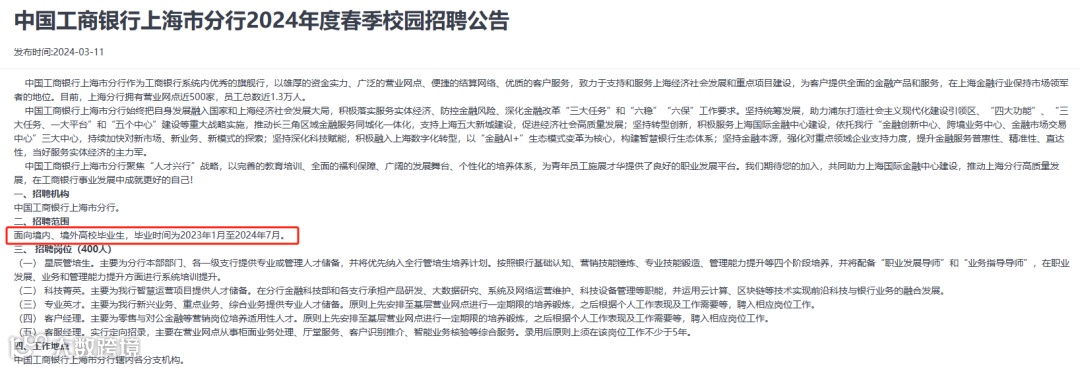 比如:工商银行、中国银行、交通银行2024年校招,接受22/23/24届毕业生投递;中信证券24年校招,招聘2023下半年至2024上半年毕业的学生投递。外资银行一般接受毕业两年甚至三年内的同学投递,如汇丰、花旗、瑞银等。