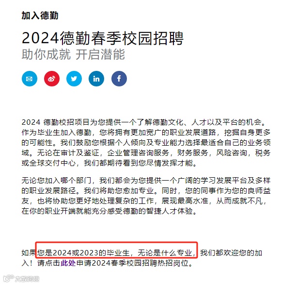 比如:普华永道24年校招,22/23/24届都可以参加,不限专业。德勤、安永24年校招,接受23和24年毕业的学生投递,不限专业。