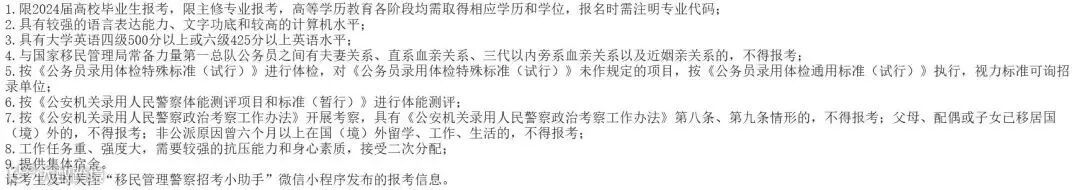 从整体看,留学生考公基本不受限制,但需要注意的是,一些涉密、保密的敏感单位如国安部、公安局、出入境边检站、移民管理局等存在部分岗位限制留学生报考。如2024年国考招考简章中“国家移民管理局常备力量第一总队”招录岗位中注明“非公派原因曾六个月以上在国(境)外留学、工作、生活的,不得报考”,即自费留学生不得报考该岗位。