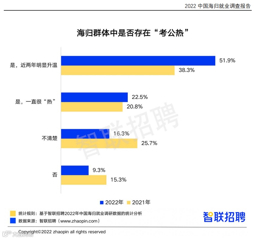 智联招聘关于留学生就业意向调查显示,有74.4%的留学生认为海归群体中存在着“考公热”现象。