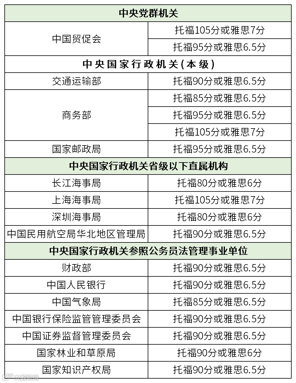 大部分留学生都考取过雅思或托福成绩,而近几年国务院发布的中央党群机关/行政机关及下属机构的招聘条件表显示,每年有近百个职位明确表示要求6.5-7.5分的雅思成绩或80-105分的托福成绩。