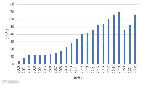2000-2022年中国当年出国留学人员数量变化