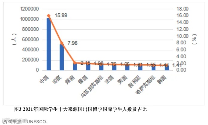 美国、中国、德国、法国不仅是前十大留学目的国,还是前十大留学来源国。其中,中国是国际生最大的来源国,全球15.99%的国际学生都来源于此。