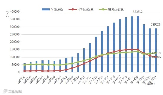 从2000年到2019年,尤其是在2008年北京奥运会后,中国的留学人数经历了快速增长,与中国参与全球化的趋势一致。尽管2022年的留学人数尚未恢复至2019年的水平,但从2023年美国、英国等国对中国学生签发的留学签证数量来看,中国学生的海外留学需求仍然旺盛,出国留学的趋势正在稳步复苏。
