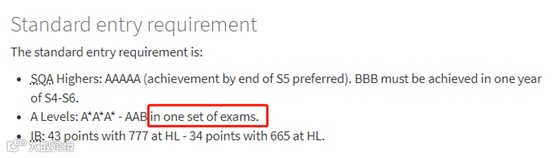 对于A Level的学生要求三门成绩在AAB-A*A*A*,且3门成绩in one set of exams,即3门成绩在同一个考试季最终出分。