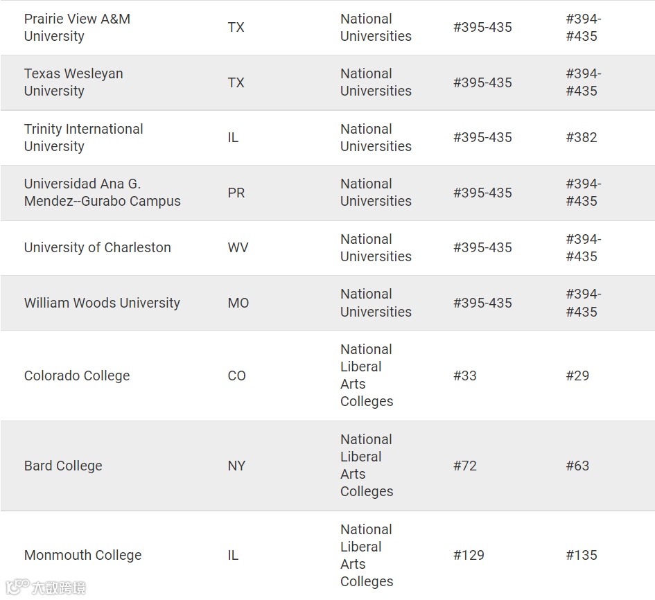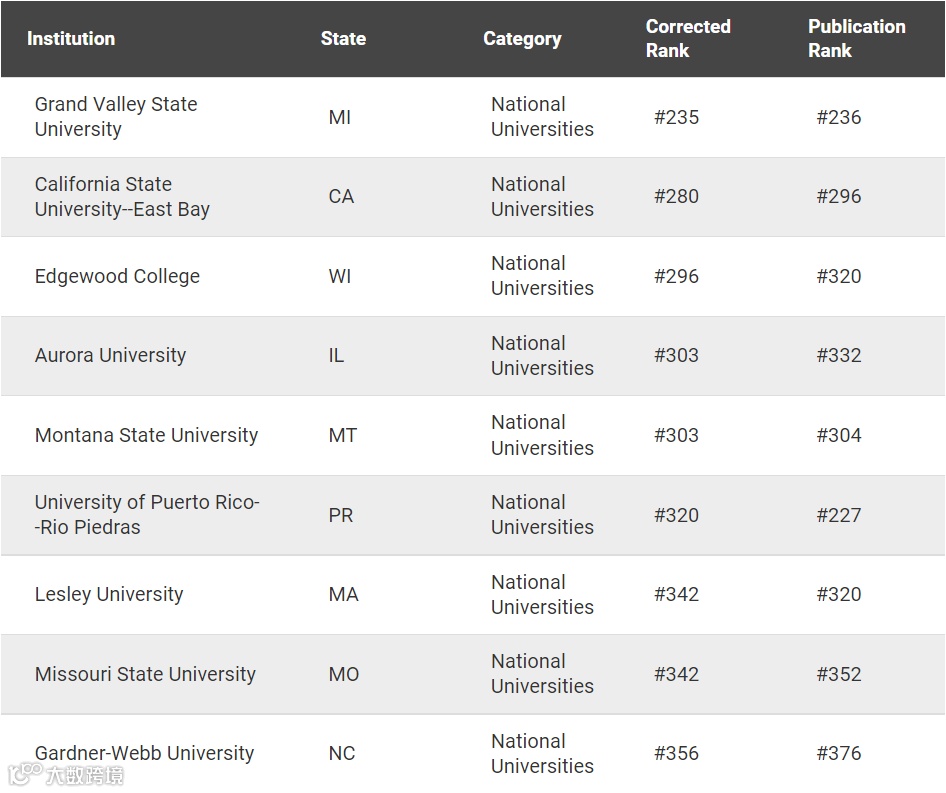 这次数据更正了在全美最佳综合大学排名的26个院校排名、在全美最佳文理学院排名中的13个院校排名,和部分地区大学排名的院校数据。