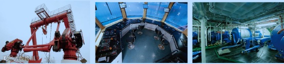 配有国内首套升降鳍板、侧推封盖,装有艉A架、侧A架、CTD伸缩吊、ROV A架、地震系统、声学设备等,可提供低噪声的声学探测环境。