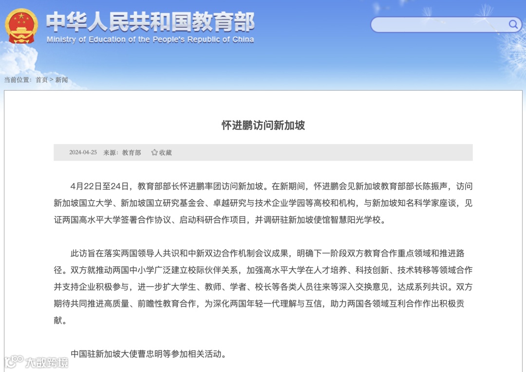 4月22日至24日,教育部部长怀进鹏率团访问新加坡。在新期间,怀进鹏会见新加坡教育部部长陈振声,访问新加坡国立大学、新加坡国立研究基金会、卓越研究与技术企业学园等高校和机构,与新加坡知名科学家座谈,见证两国高水平大学签署合作协议、启动科研合作项目,并调研驻新加坡使馆智慧阳光学校。