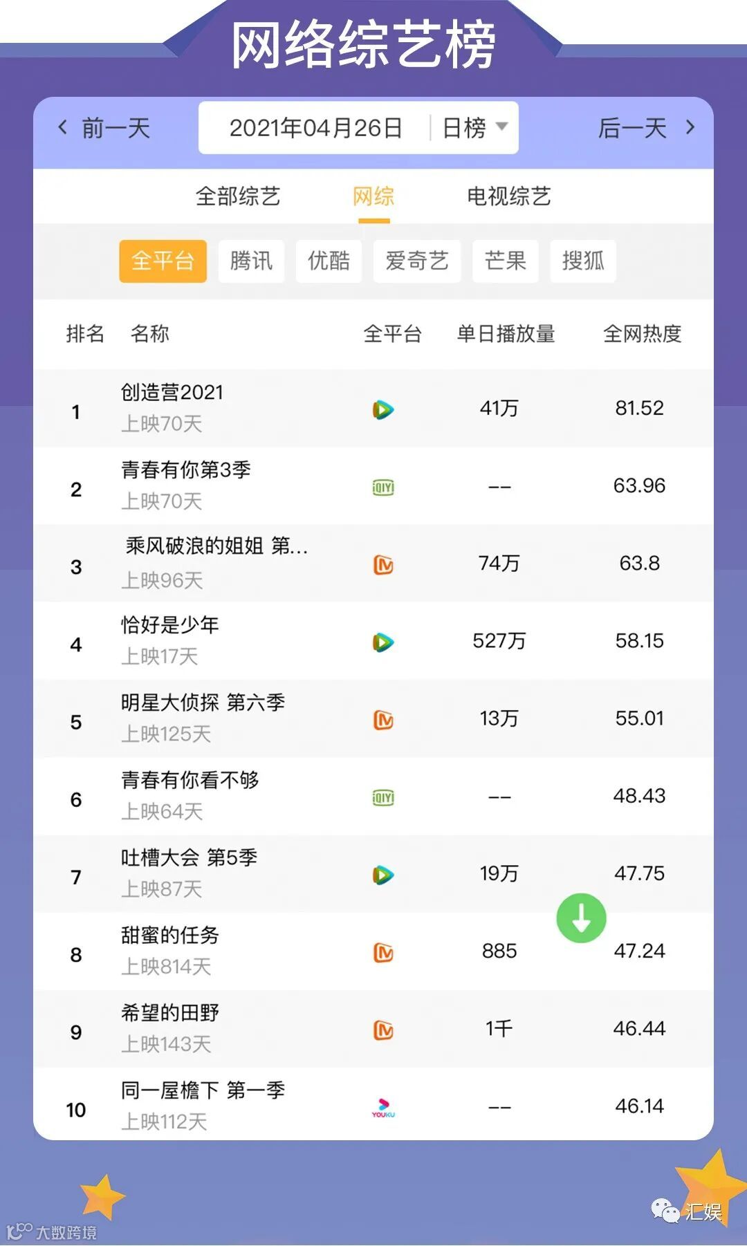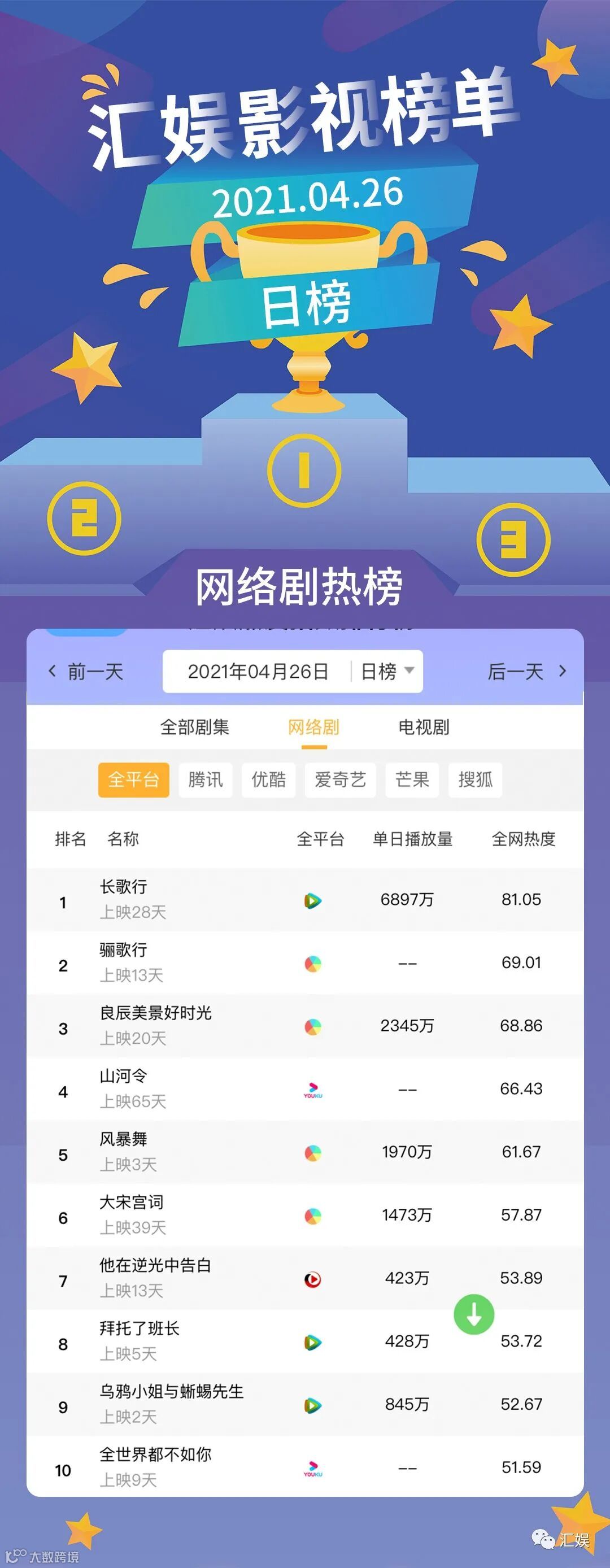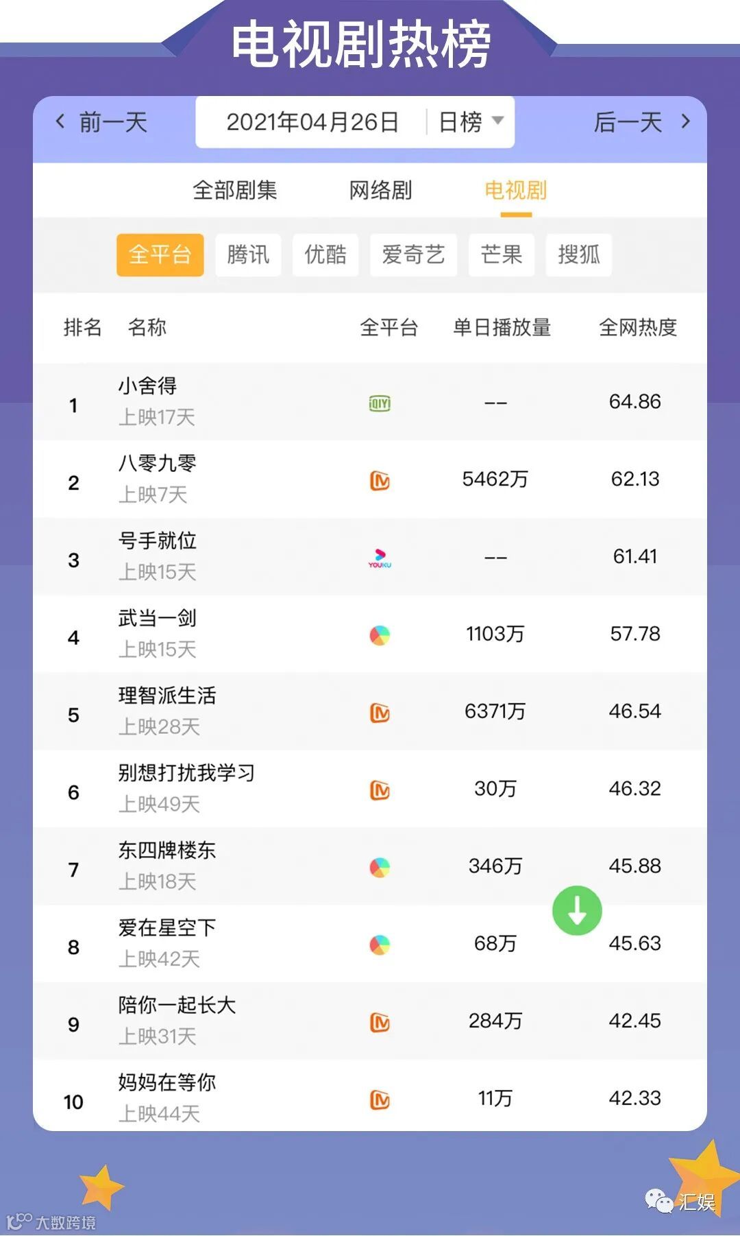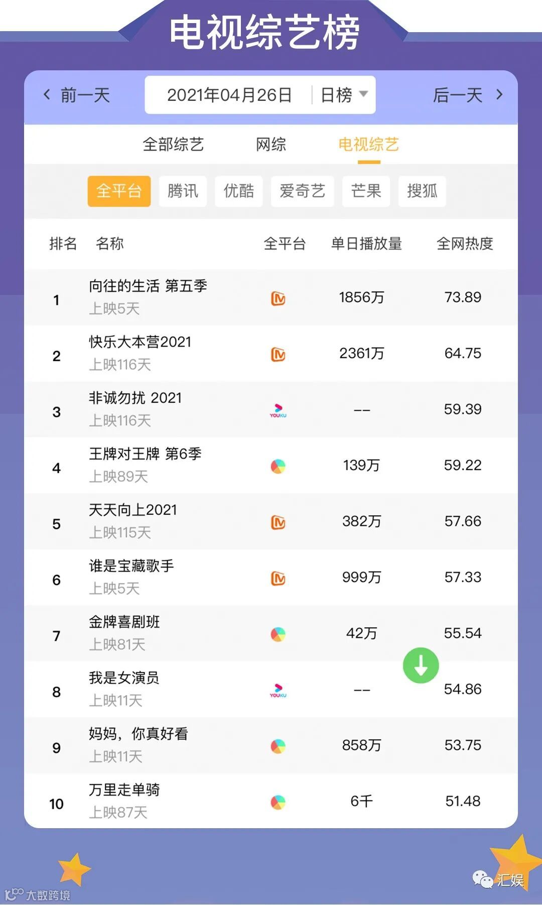 汇娱数据 | 2021.04.26 剧集、综艺、艺人全网平台热度指数
