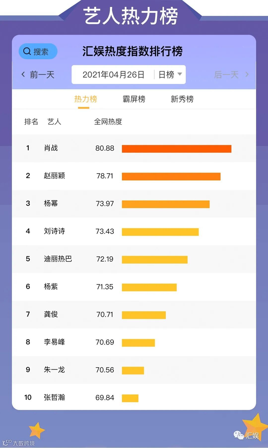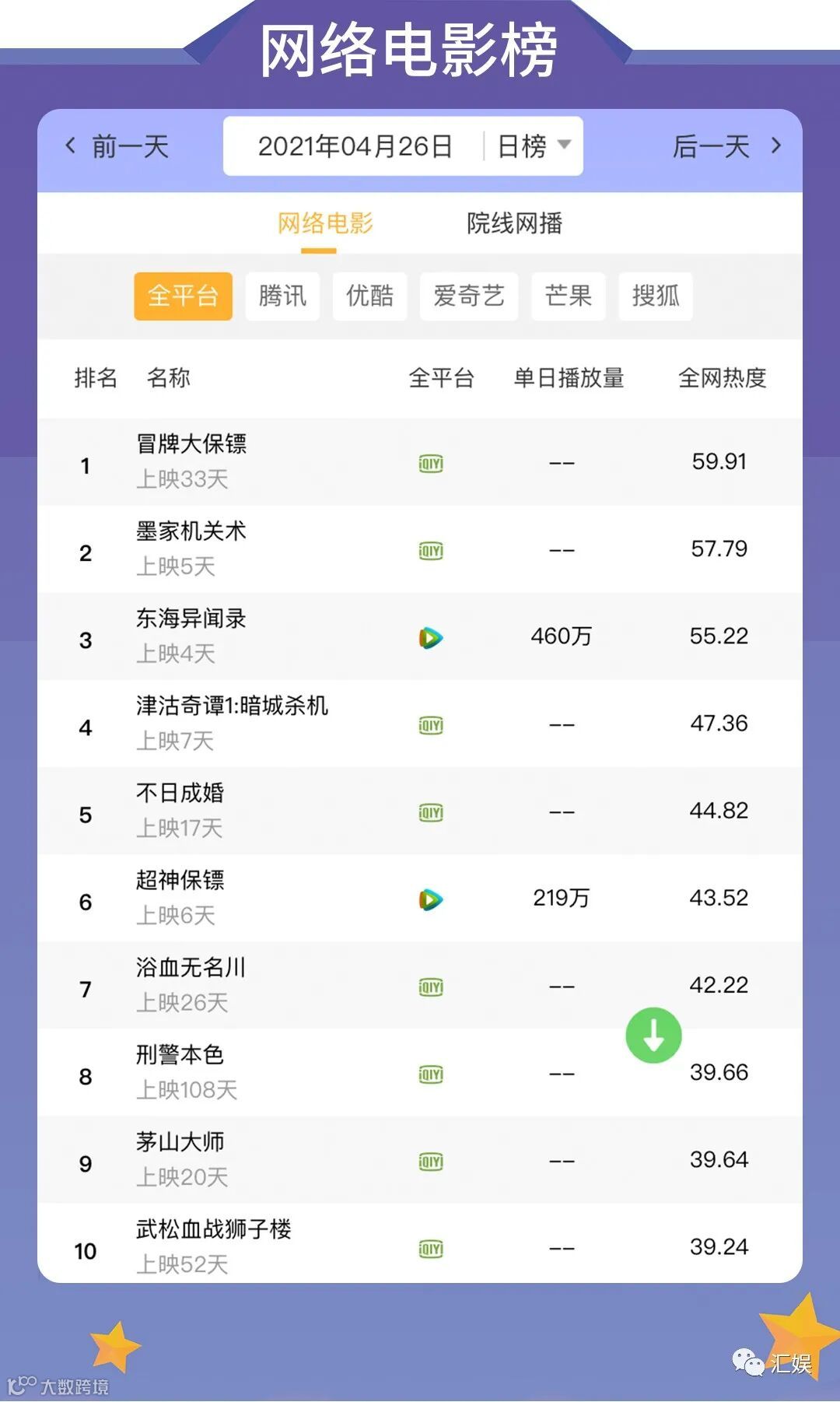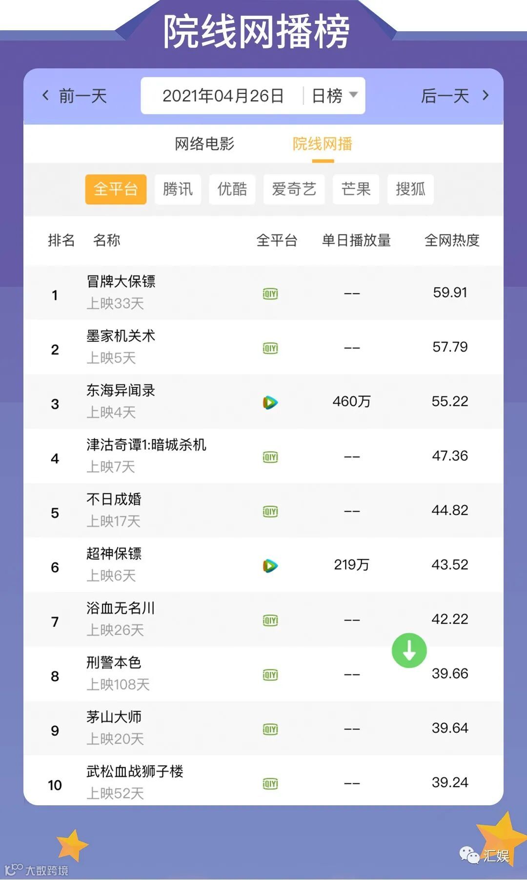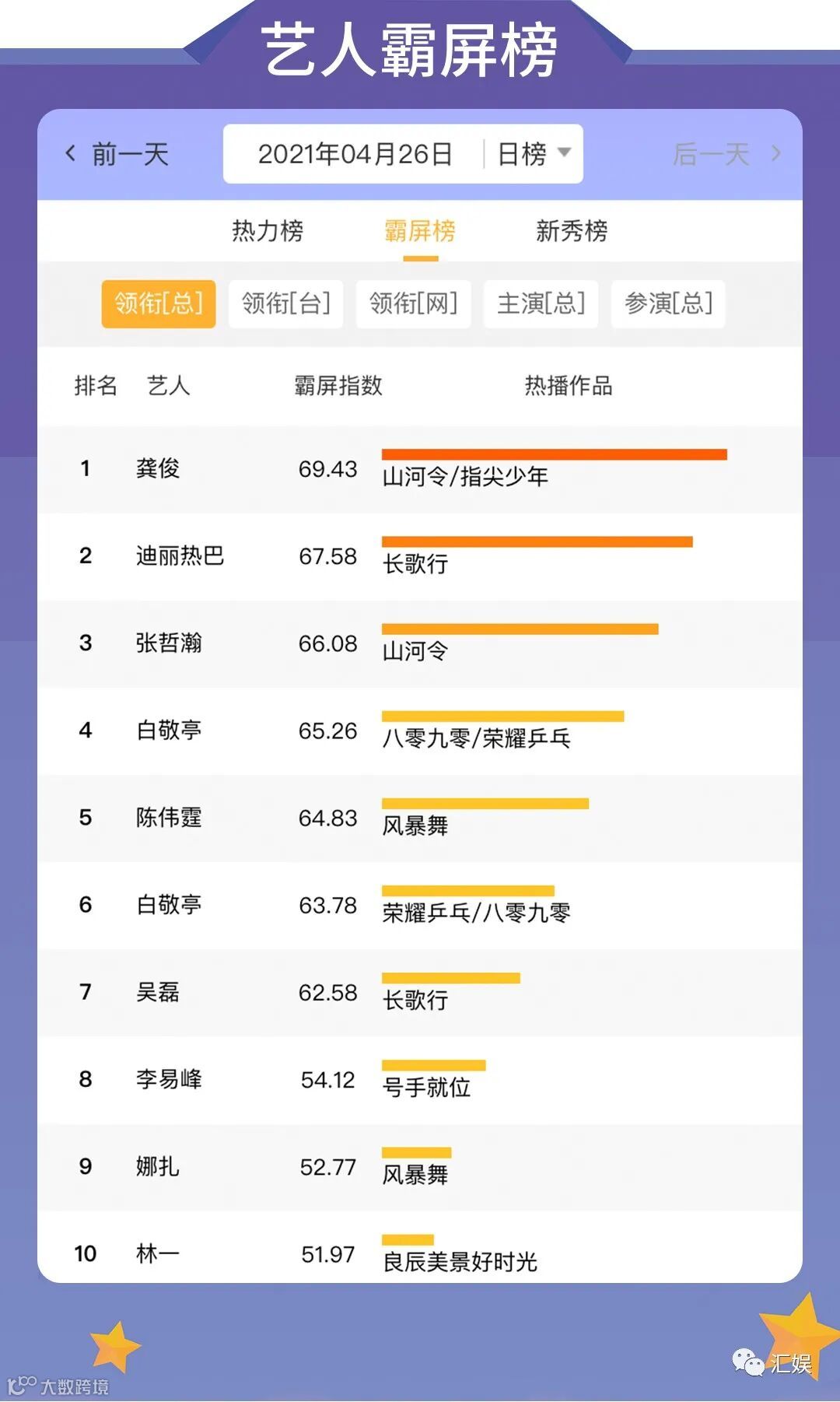 汇娱数据 | 2021.04.26 剧集、综艺、艺人全网平台热度指数