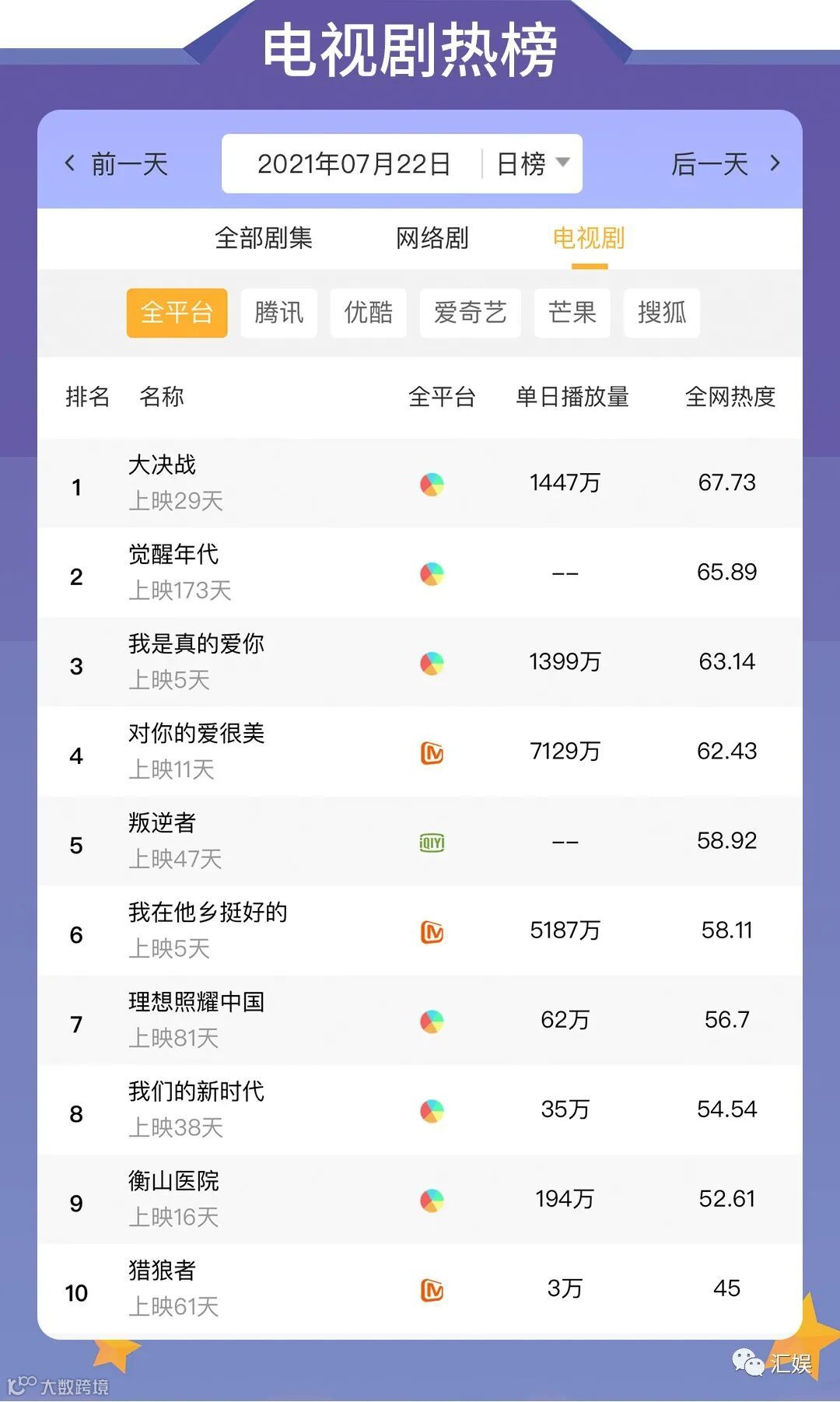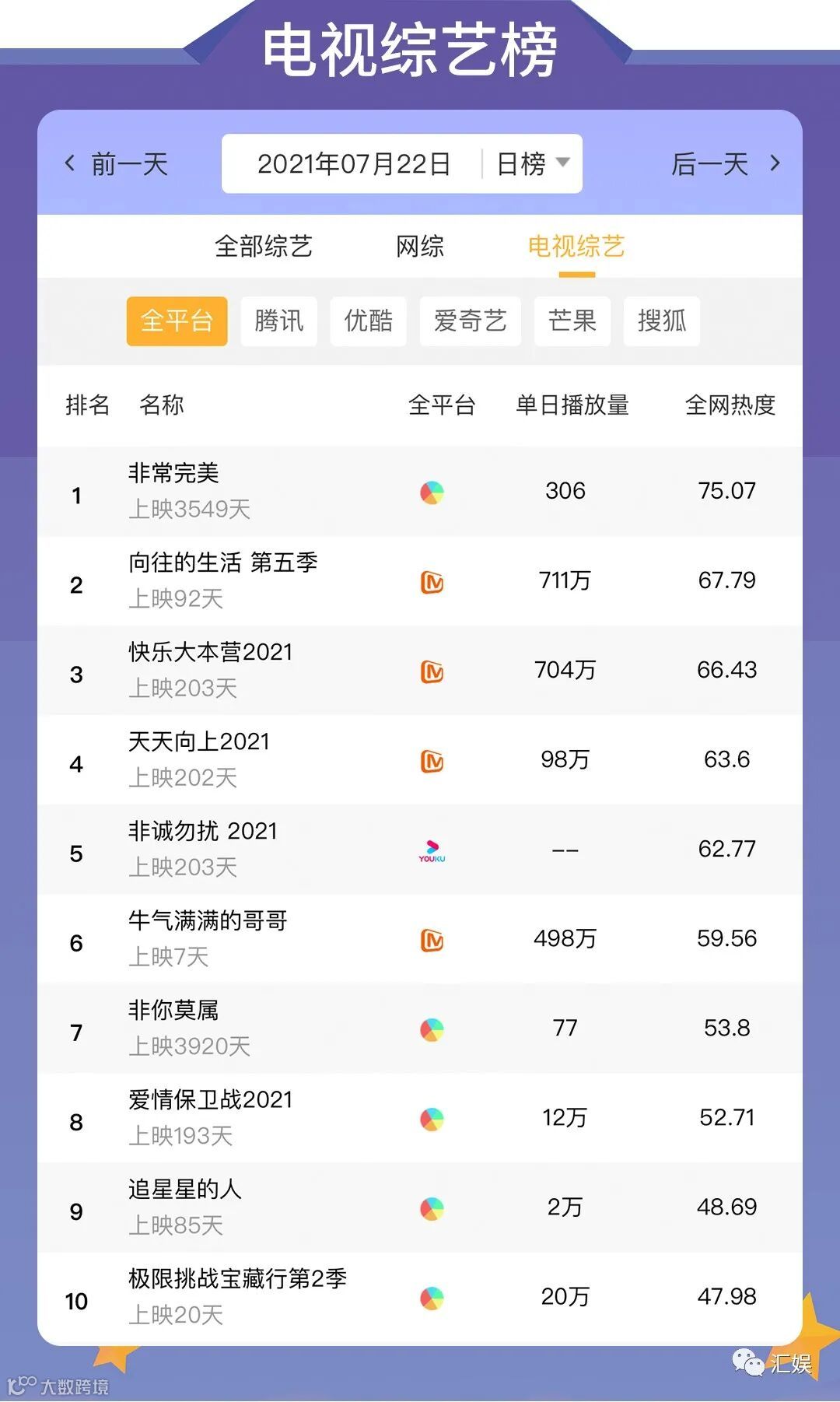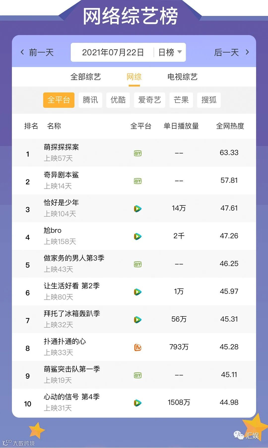 汇娱数据 | 2021.07.22 影视、综艺、艺人全网平台热度指数