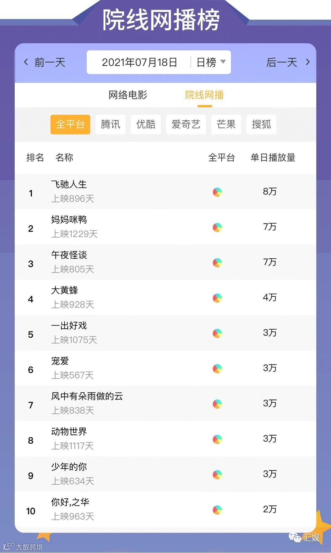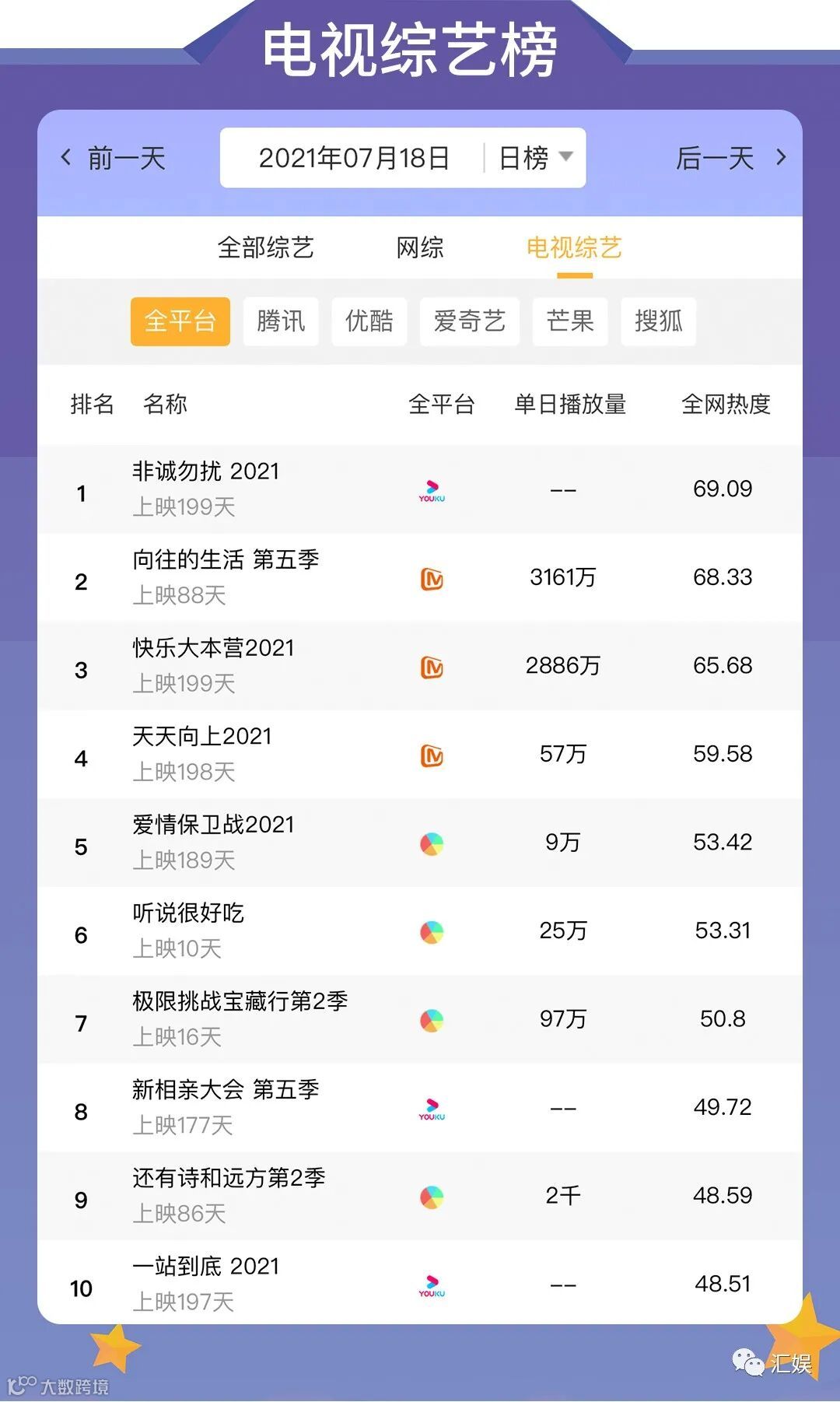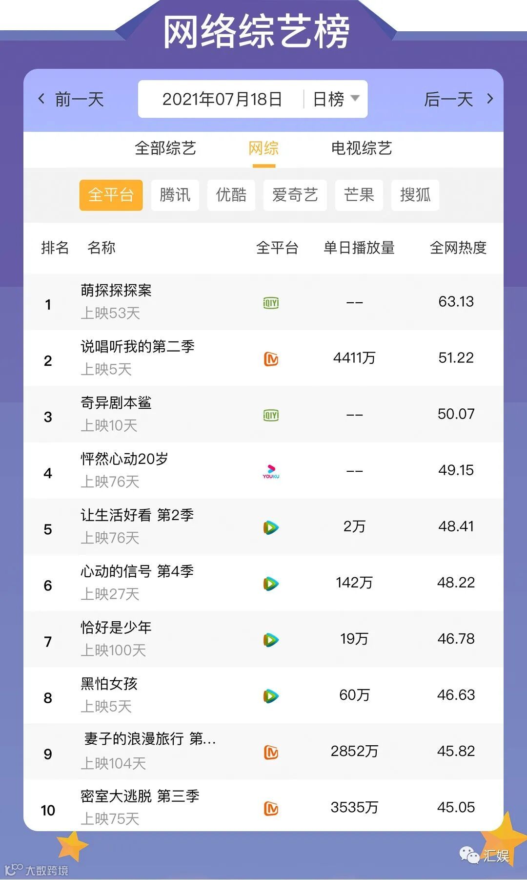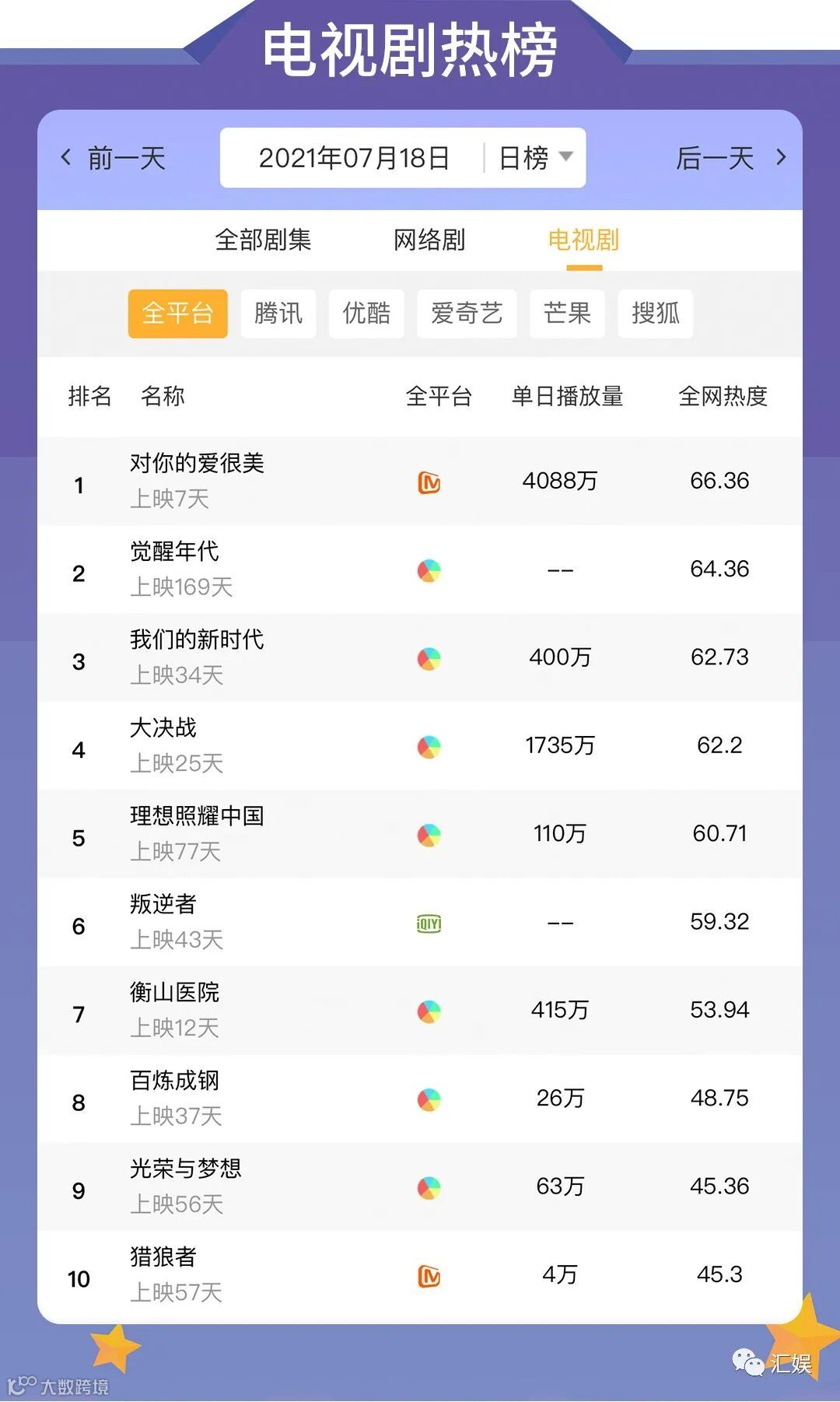 汇娱数据 | 2021.07.18 影视、综艺、艺人全网平台热度指数