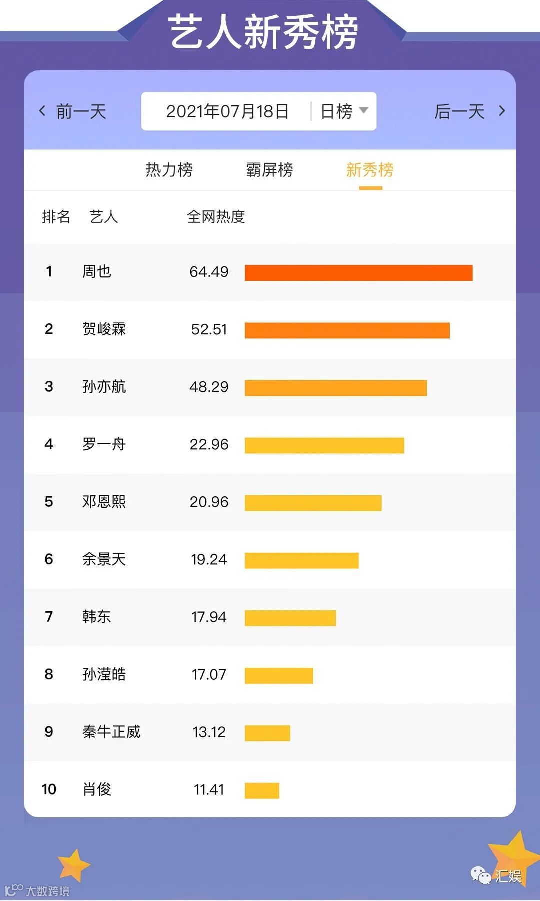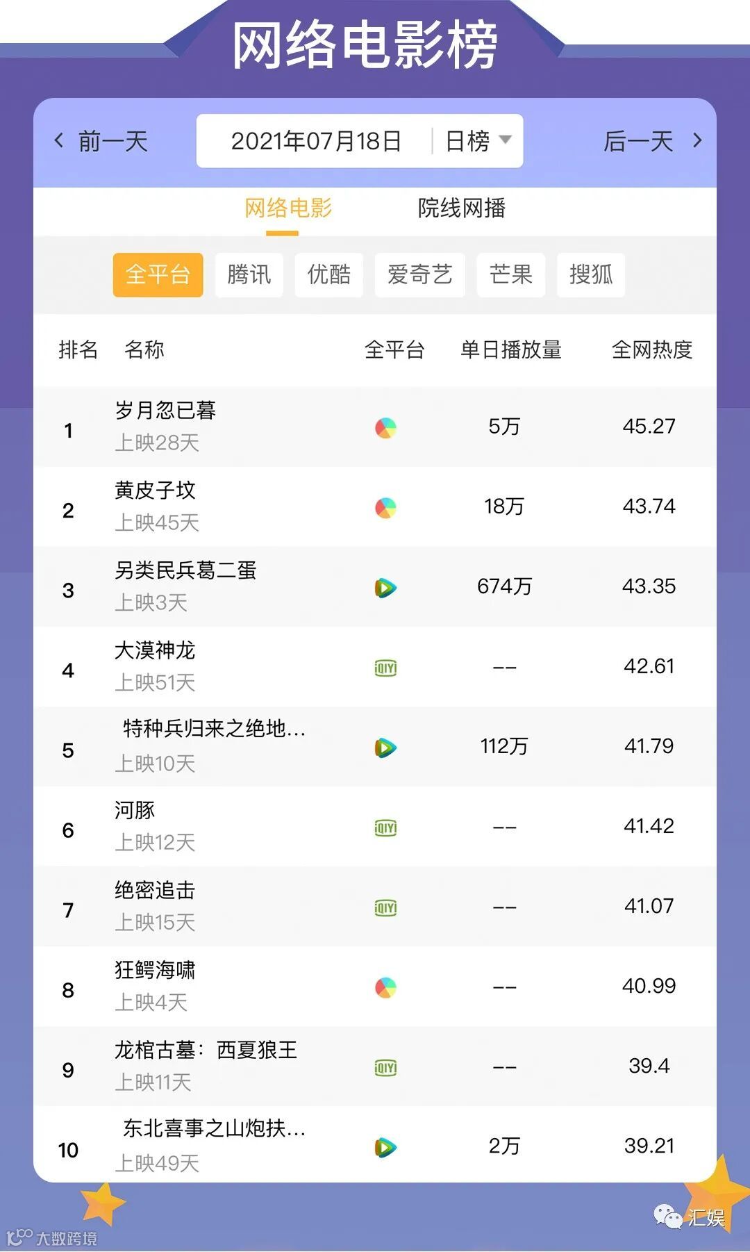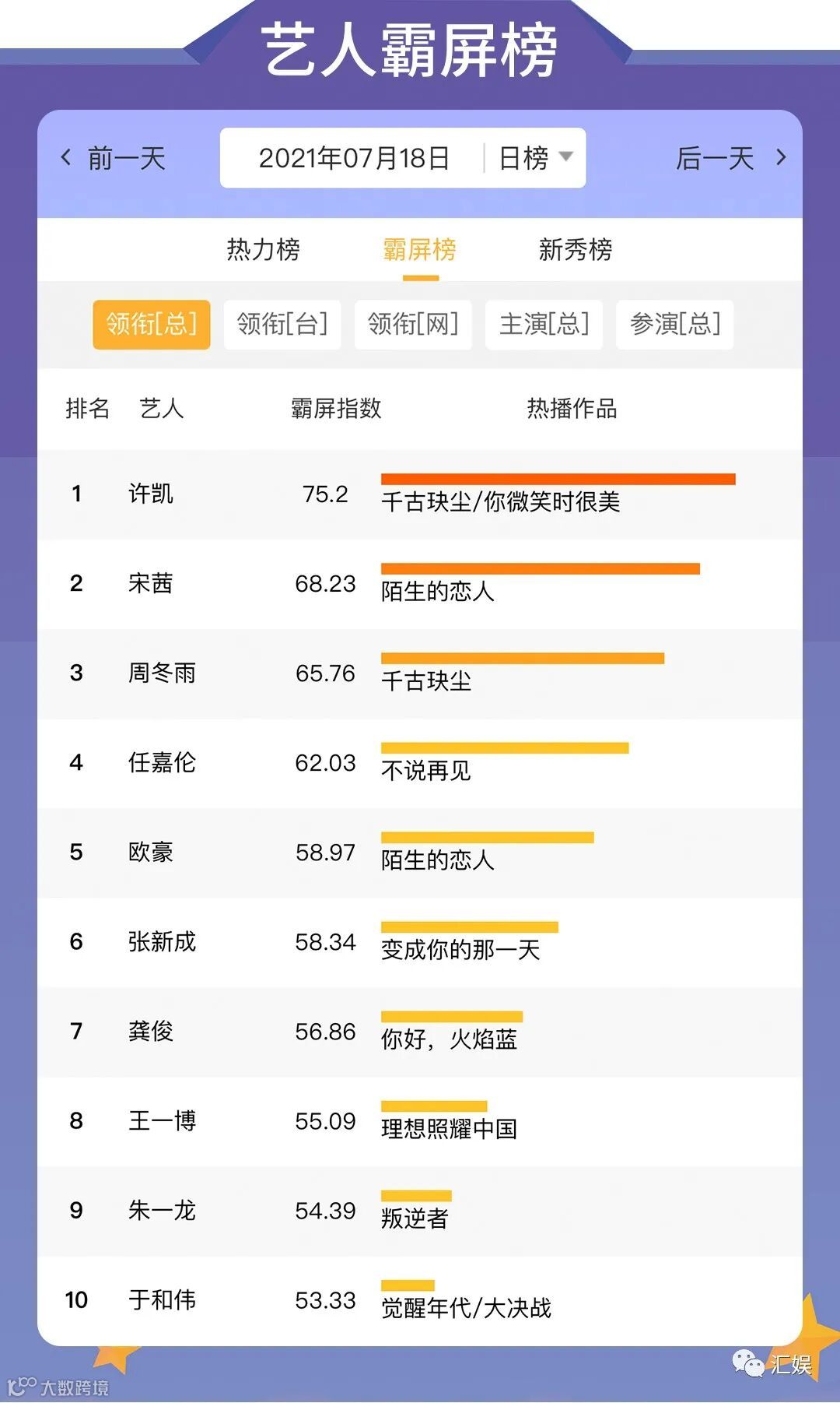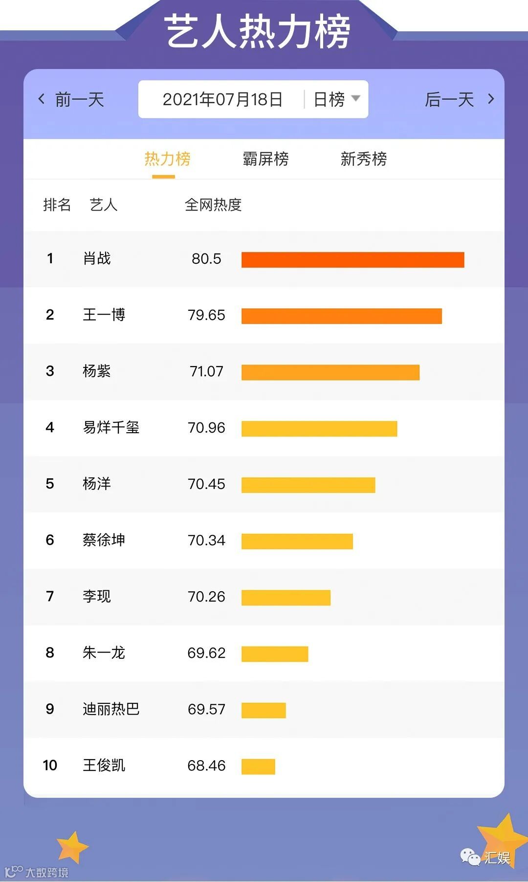 汇娱数据 | 2021.07.18 影视、综艺、艺人全网平台热度指数