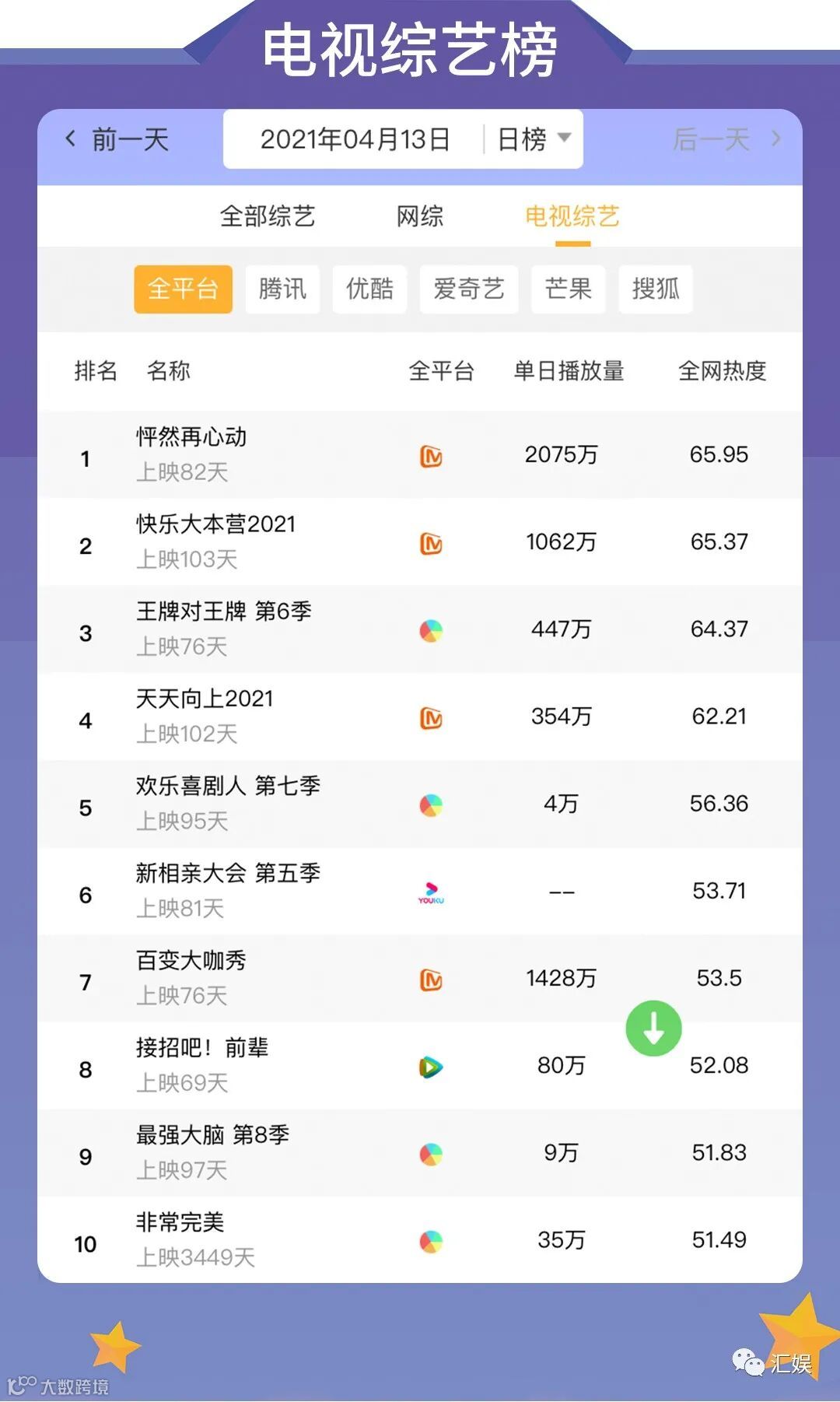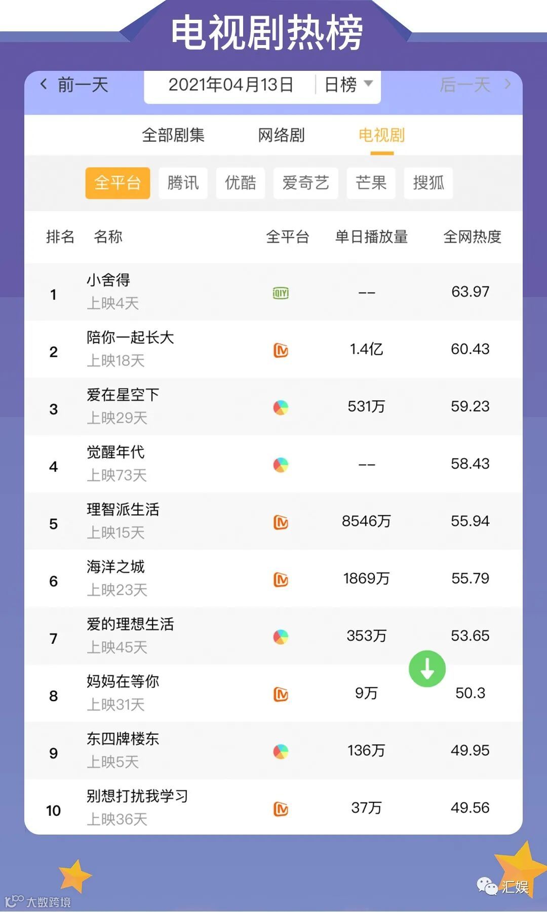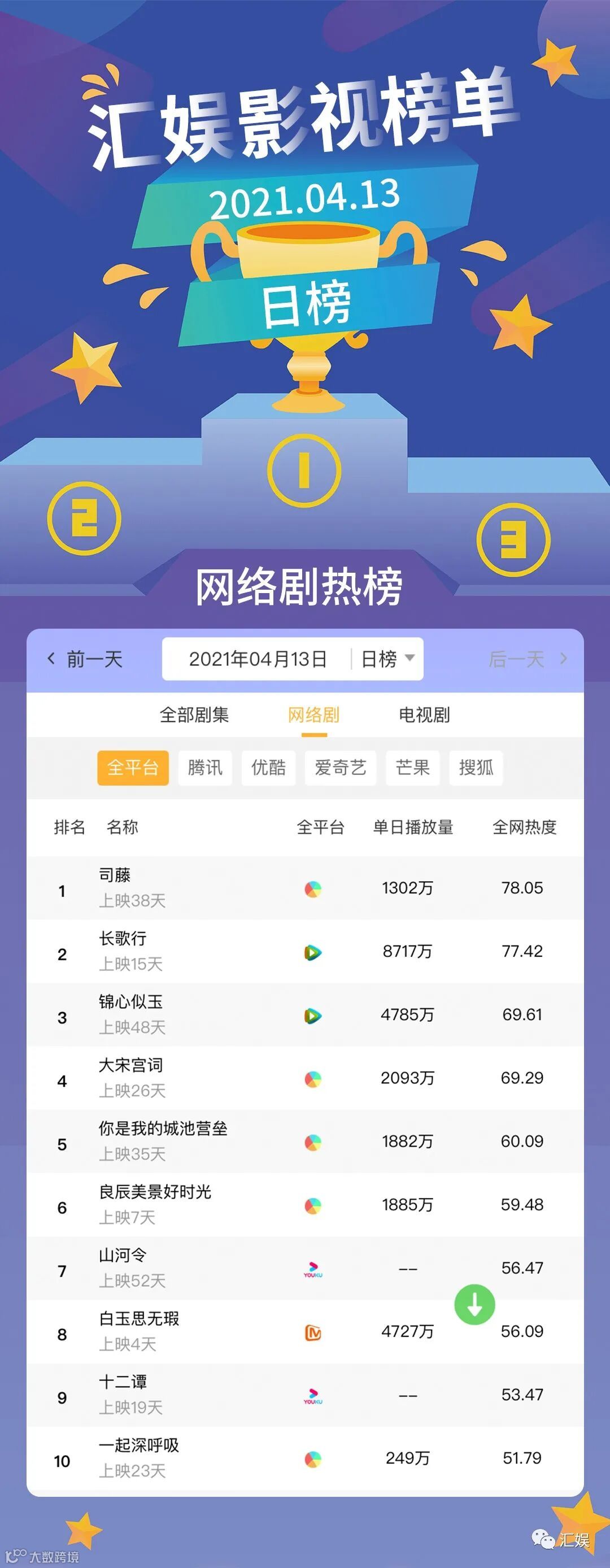 汇娱数据 | 2021.04.13 剧集、综艺、艺人全网平台热度指数