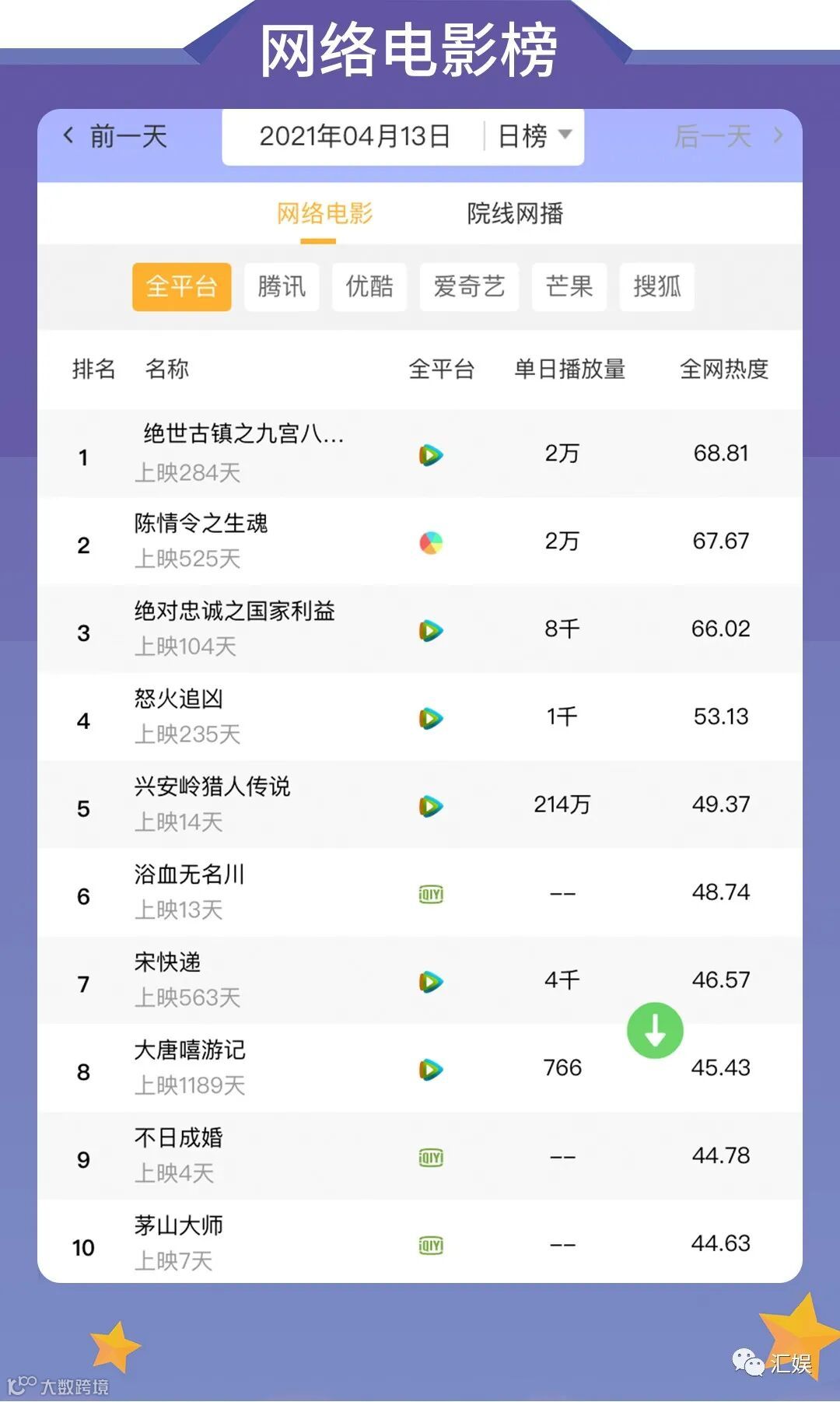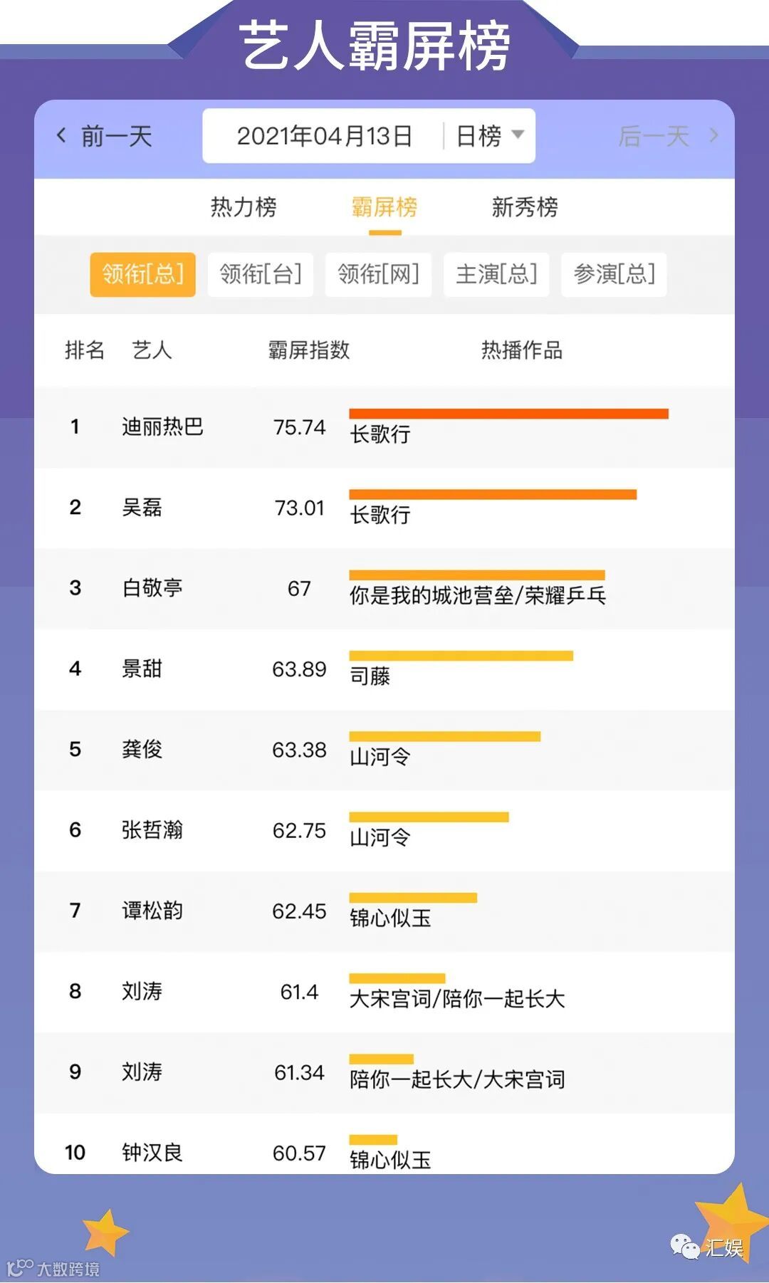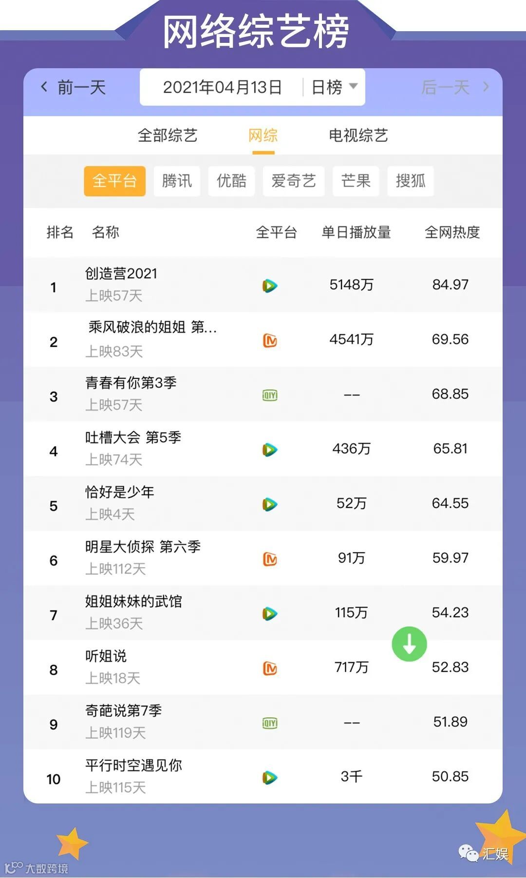 汇娱数据 | 2021.04.13 剧集、综艺、艺人全网平台热度指数