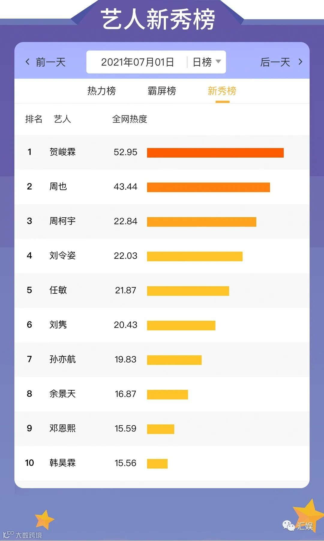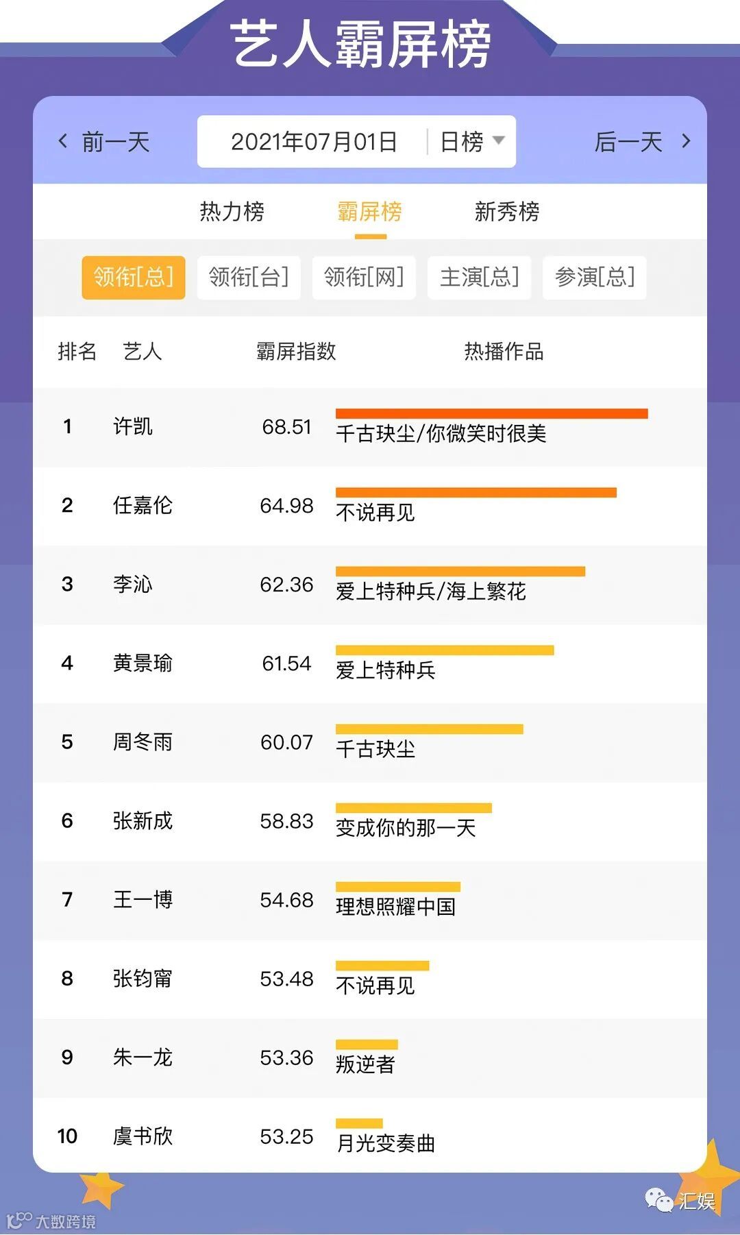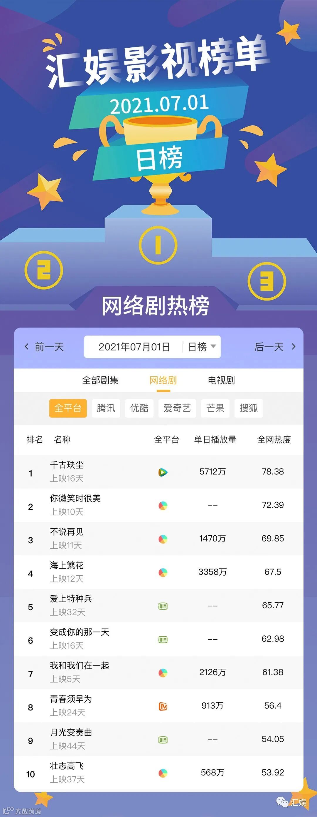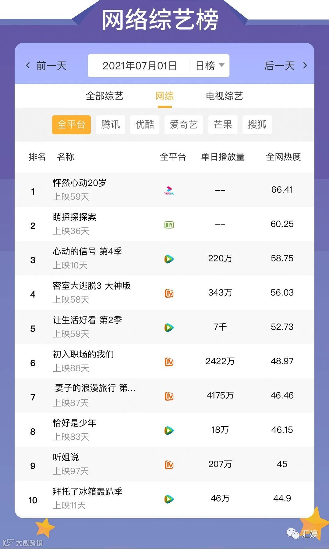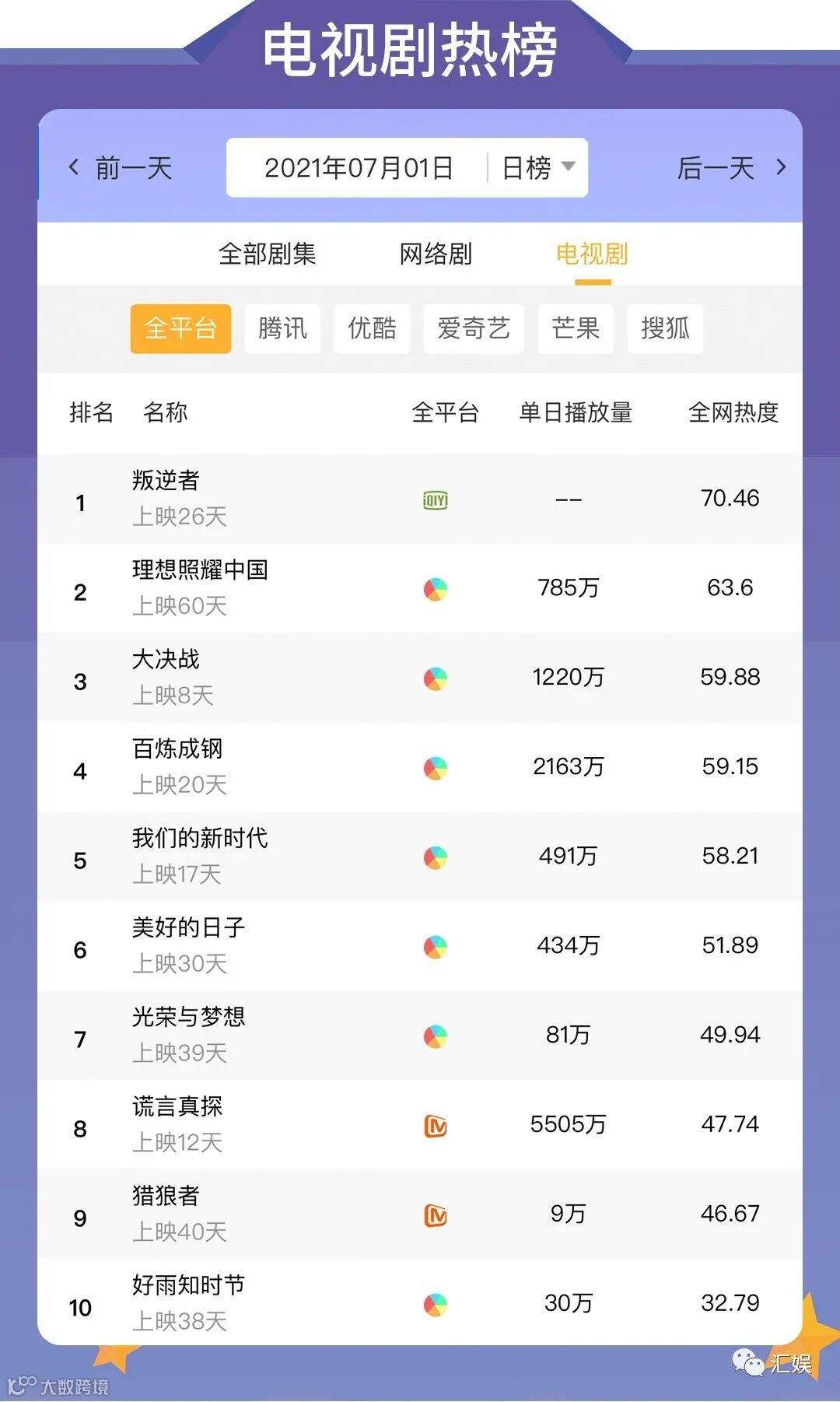汇娱数据 | 2021.07.01 剧集、综艺、艺人全网平台热度指数