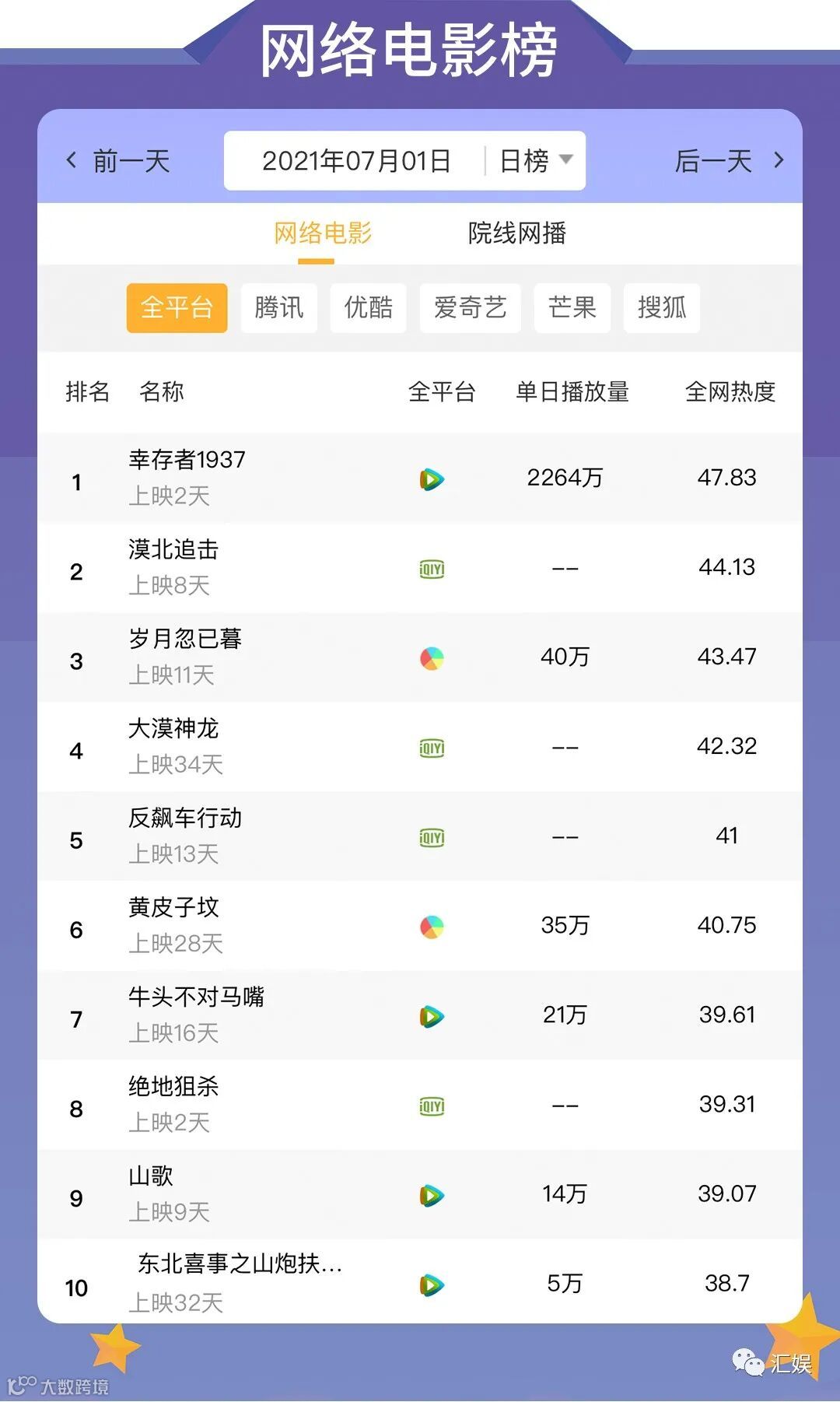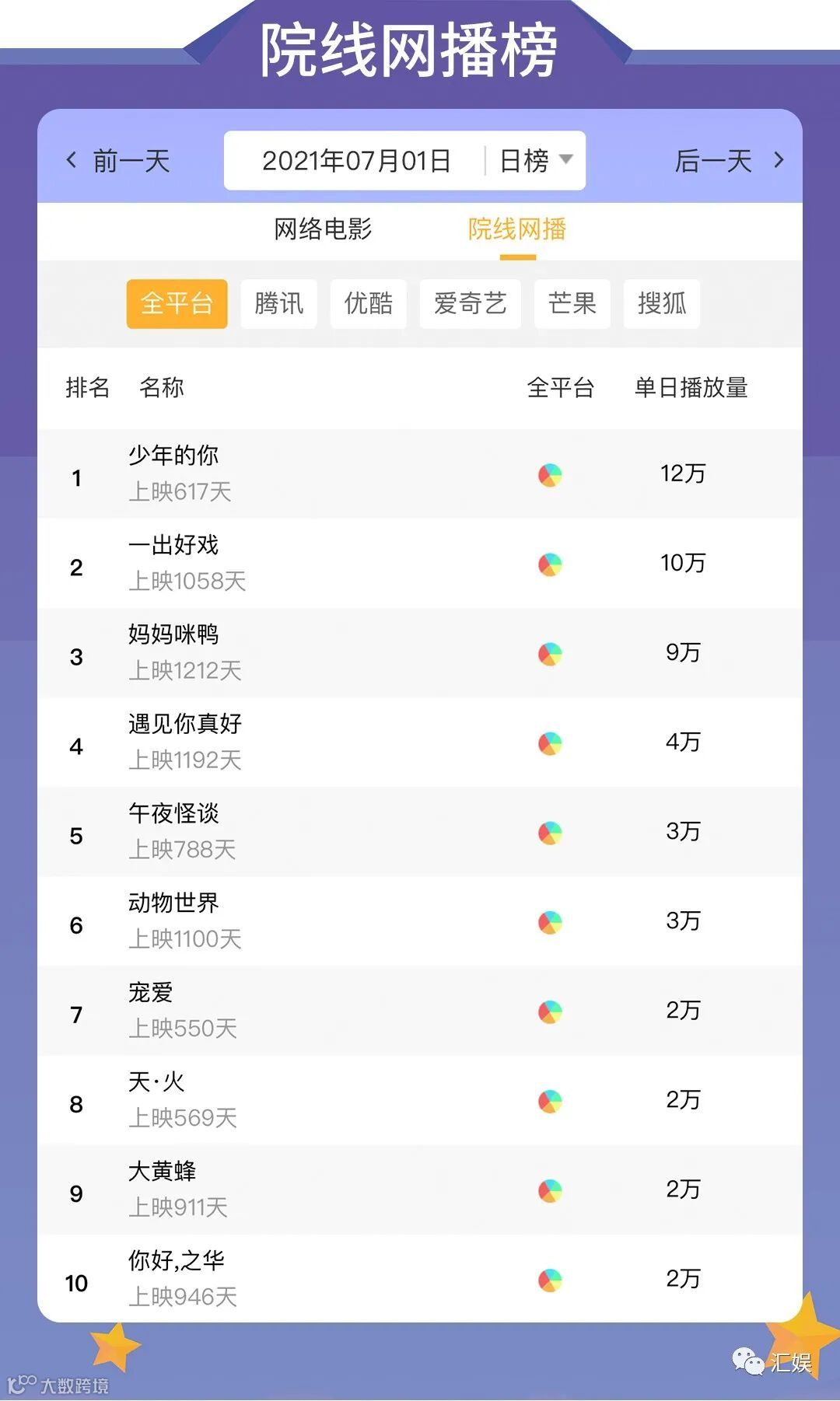 汇娱数据是一个专门针对电视剧、电影、综艺、艺人的第三方数据监测平台。现分为日榜、周榜、月榜对外发布汇娱数据榜单,包括全平台单日播放量、全网热度等一系列数据指数。