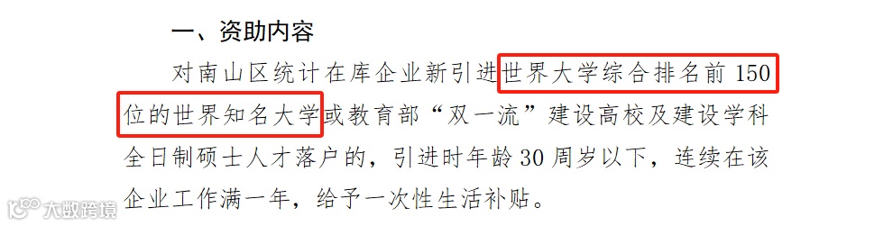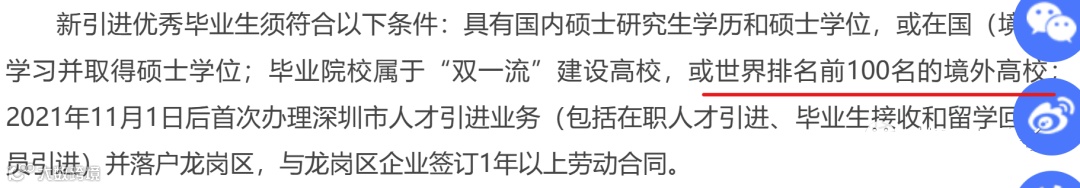 11月份深圳市委出台了一份新的人才政策文件,提及:“对新引进入户35岁以下的博士毕业生、境内外知名高校硕士及本科毕业生,分别给予相应生活补贴。”