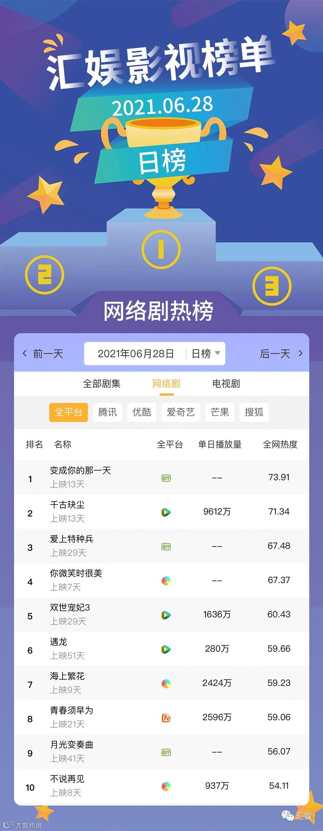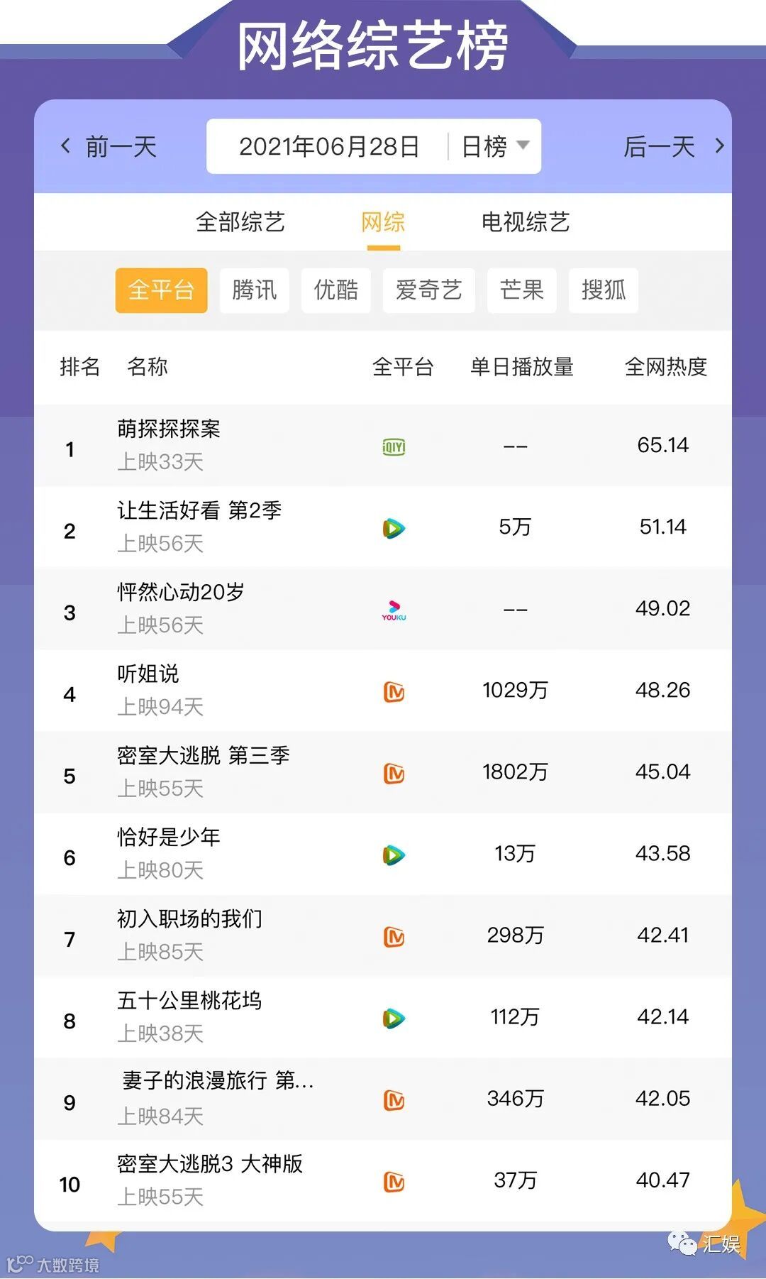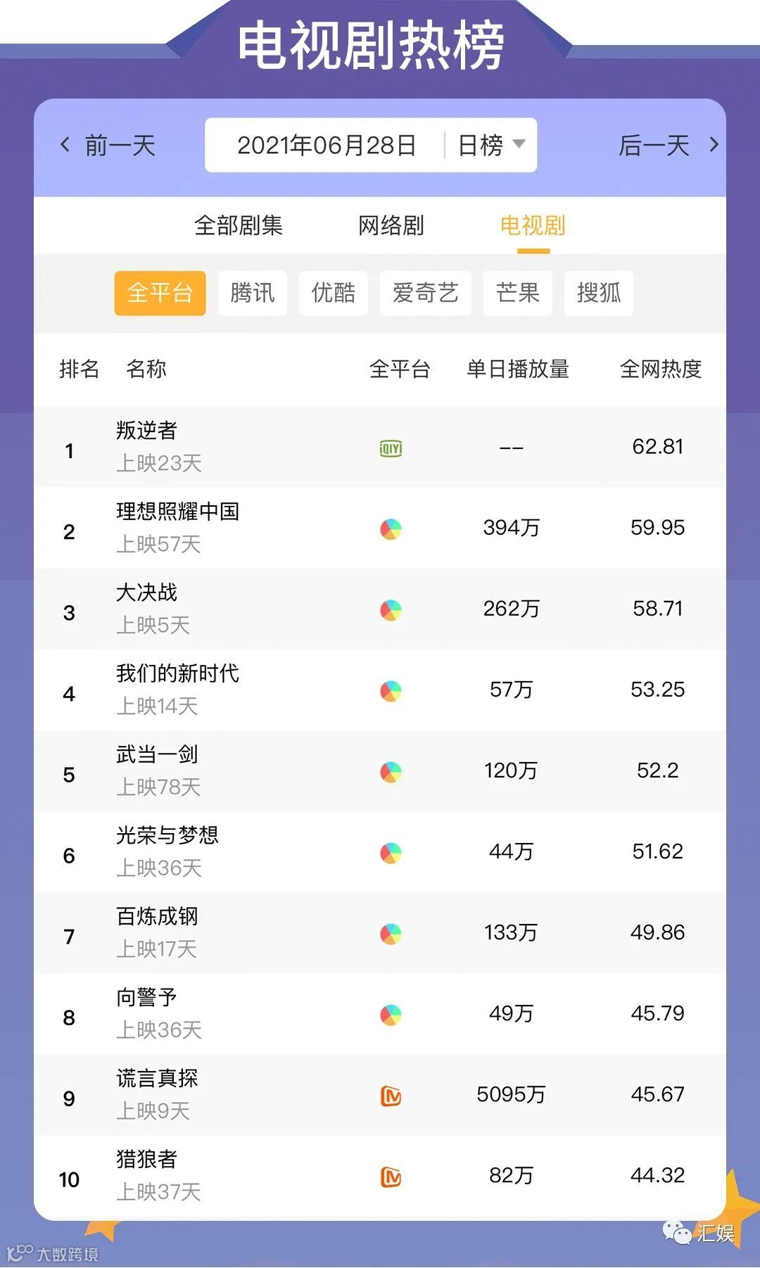 汇娱数据 | 2021.06.28 剧集、综艺、艺人全网平台热度指数