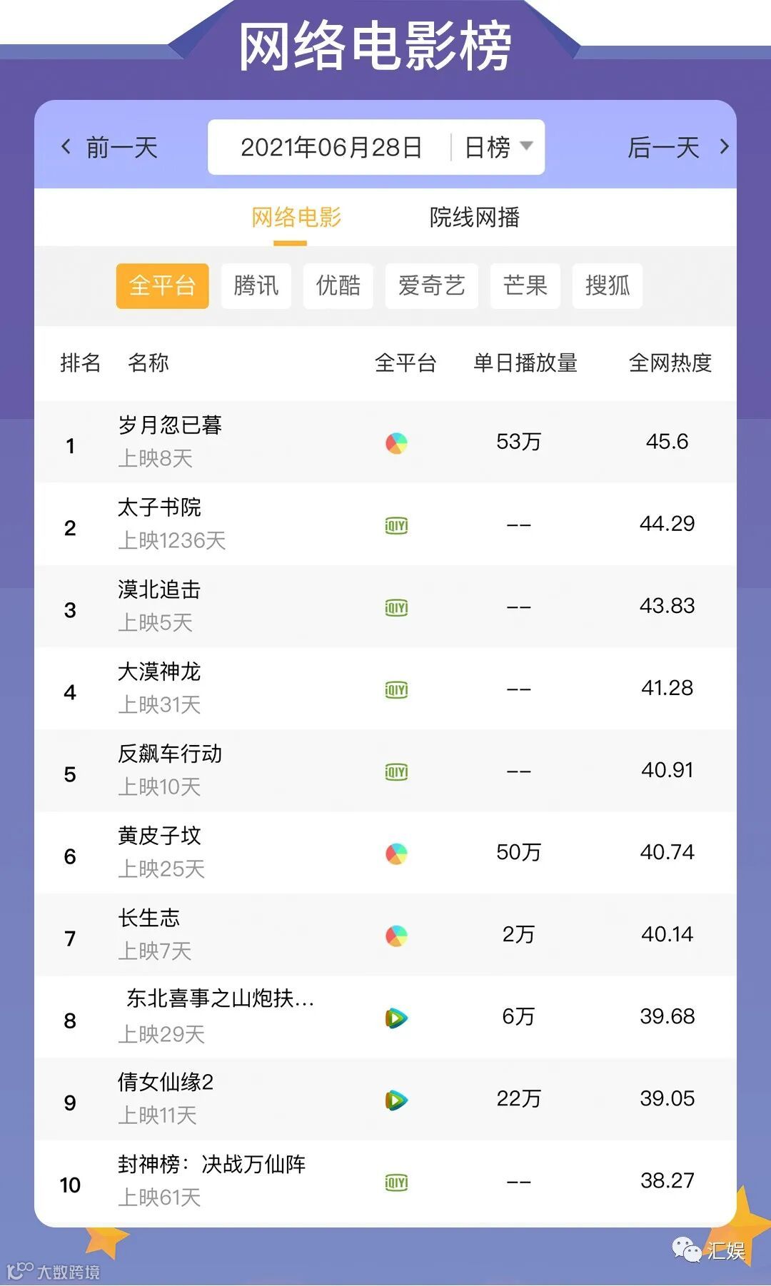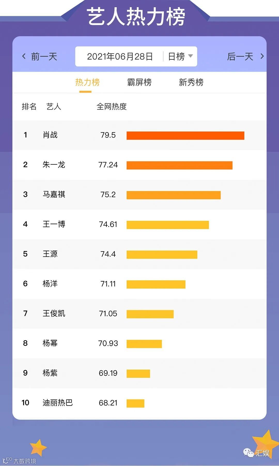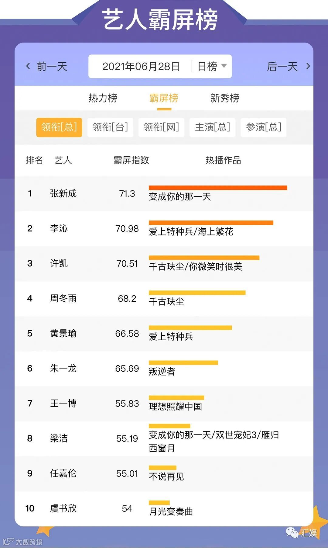 汇娱数据 | 2021.06.28 剧集、综艺、艺人全网平台热度指数