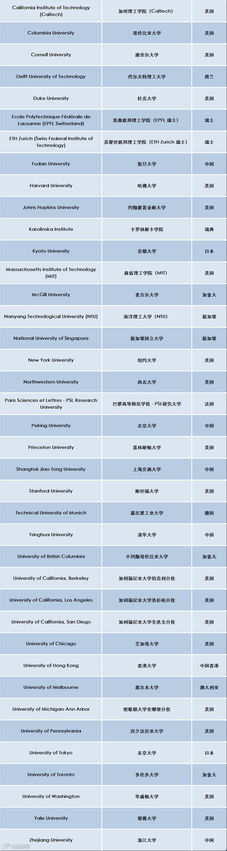 因为这些院校需要至少在两个世界大学排名中位列世界前50,所以这些名单每年也会发生变化。2023年的院校一共有39个,比去年减少了一所。
