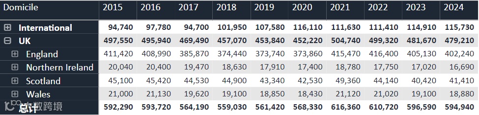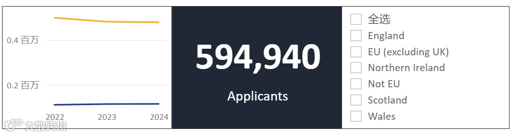 根据UCAS公布的数据,截止到2023年1月31日,共有594,940名学生申请,较 2023 年下降了 0.3%。其中,英国本土申请人数为479,210人,也较去年的481,670人有所下降。