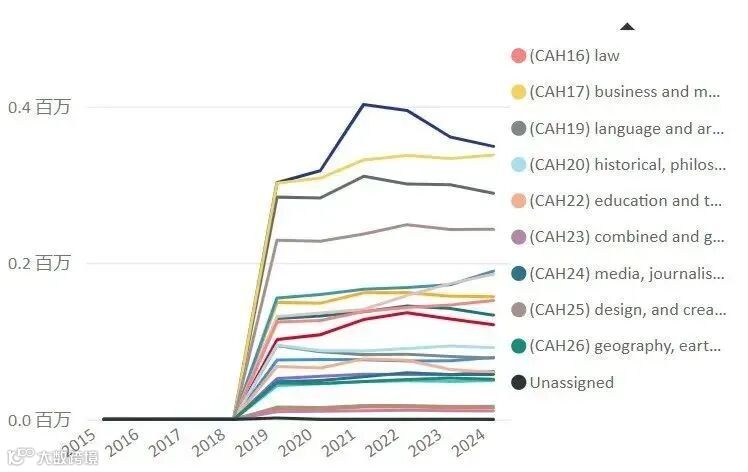 2024年最受学生欢迎的专业中,医学相关方向、商科与管理方向、社会科学方向稳坐前三席,申请人数分别为348,930、337,950、288,980。