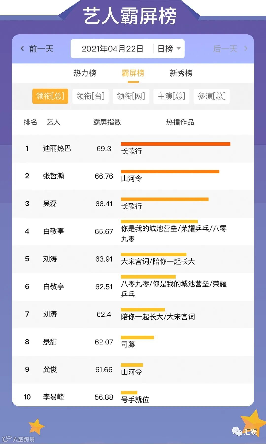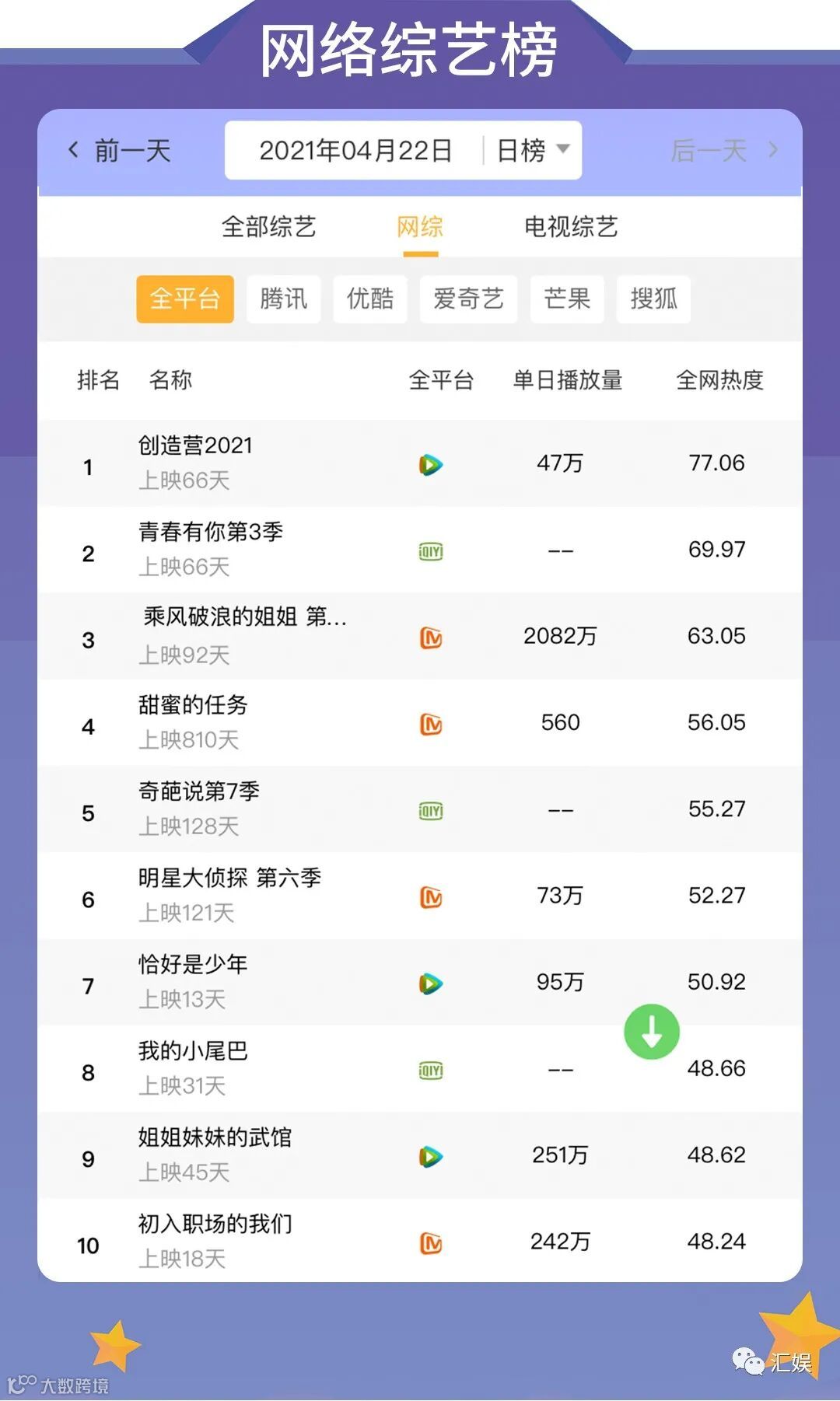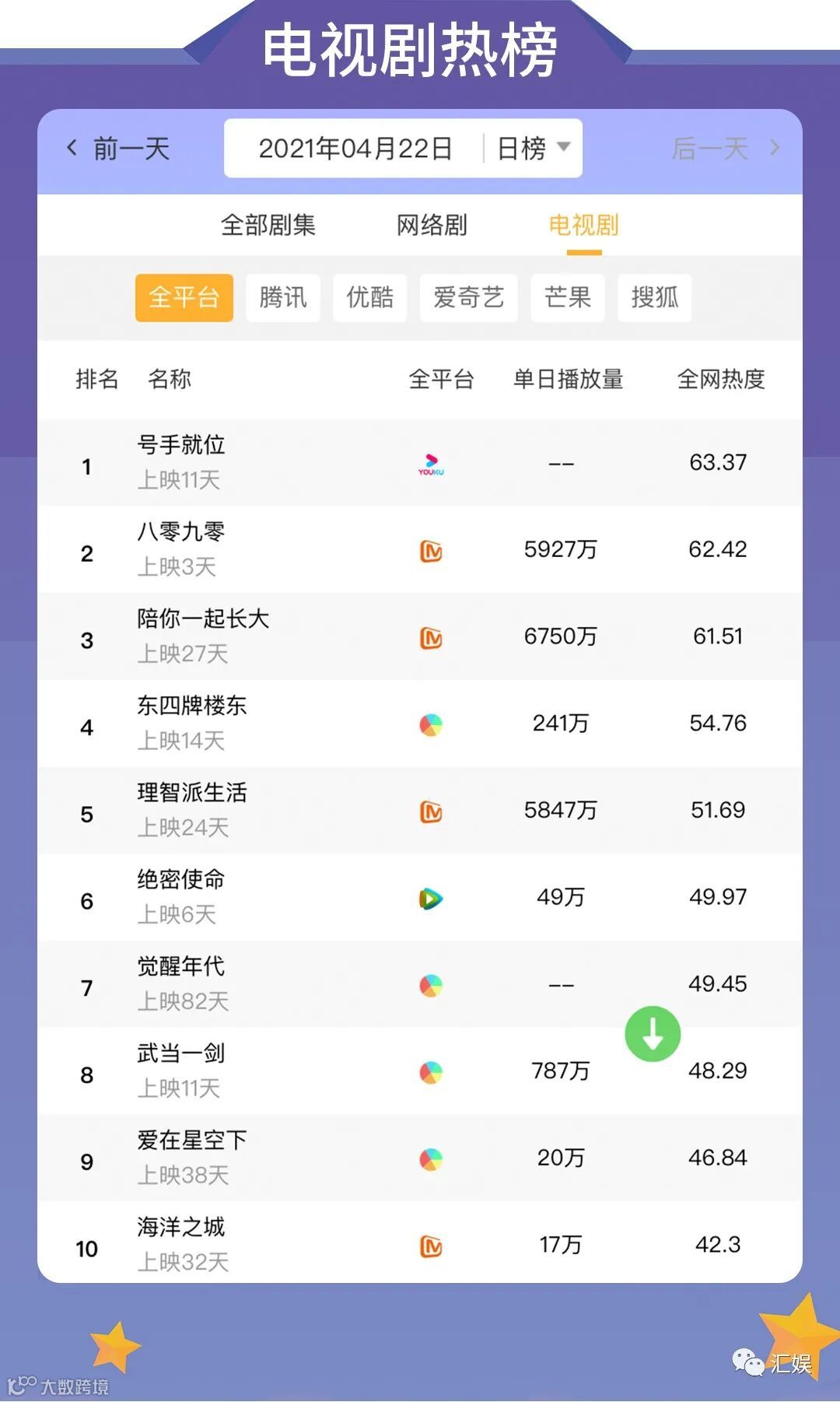 汇娱数据 | 2021.04.22 剧集、综艺、艺人全网平台热度指数