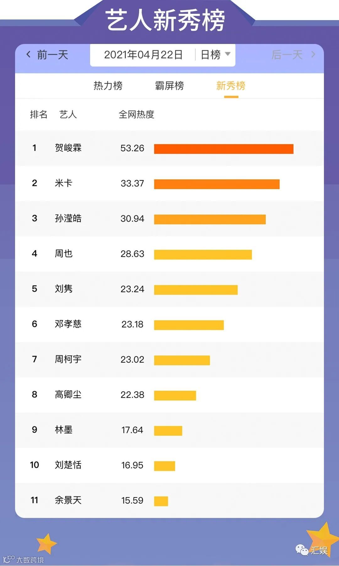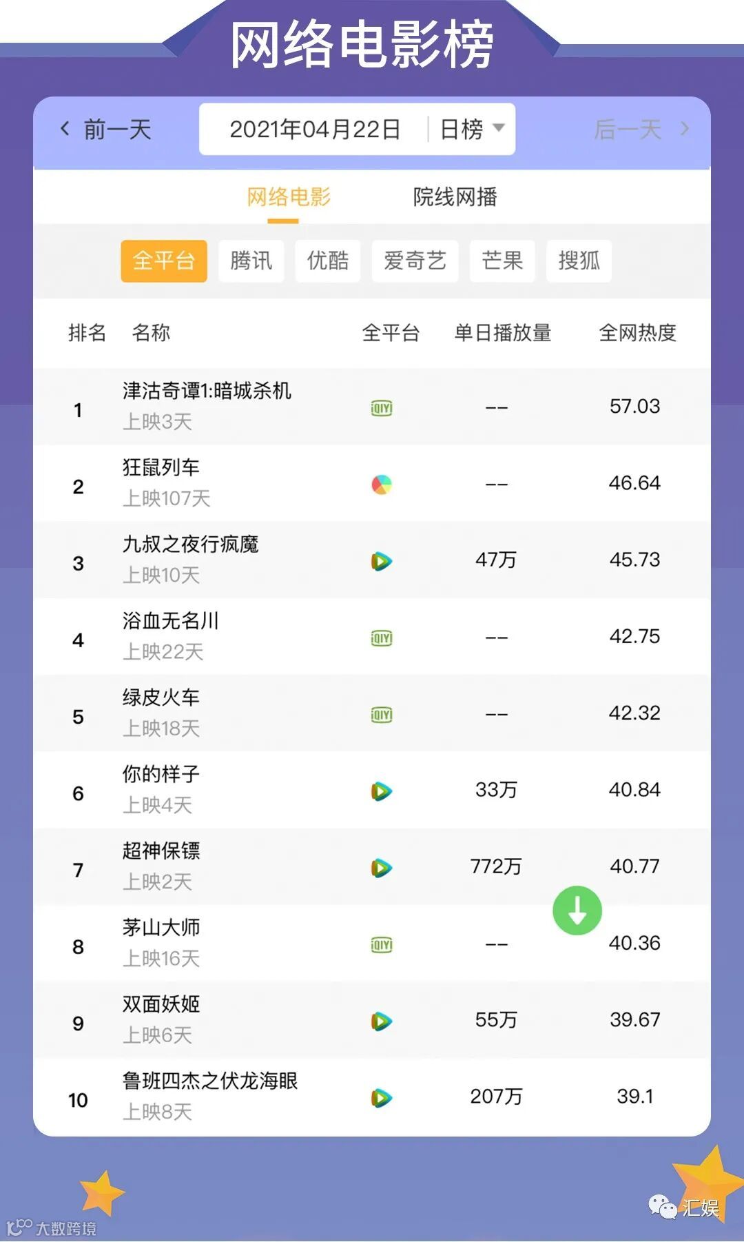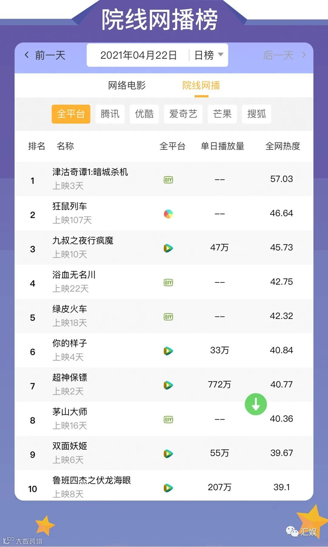 汇娱数据 | 2021.04.22 剧集、综艺、艺人全网平台热度指数