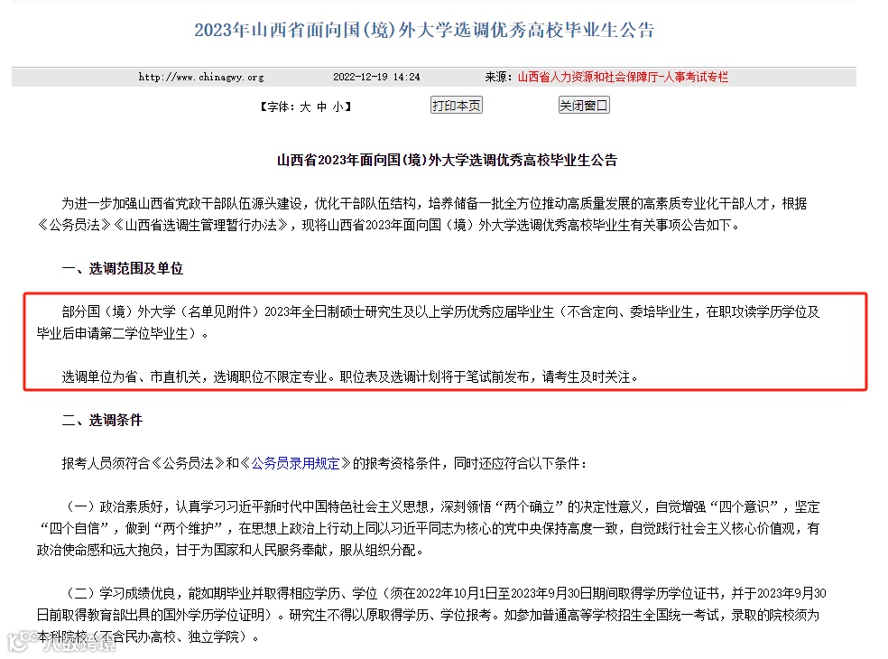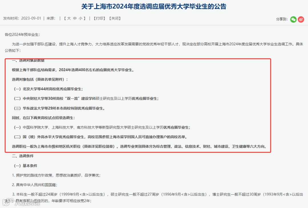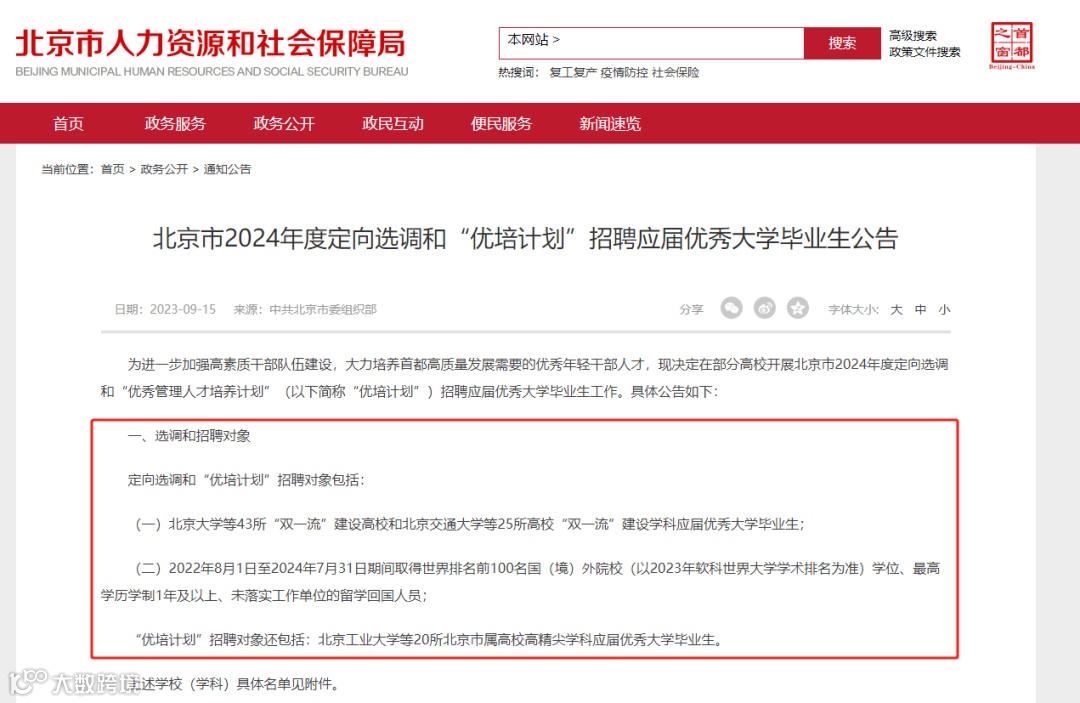 北京则向2023年软科世界大学学术排名榜单前100名院校的归国留学生,开放了申请2024年度北京定向选调的资格。