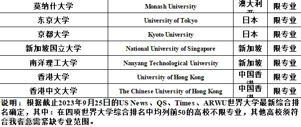 以及2022年10月1日至2023年9月30日期间取得学位并完成中国(教育部)留学服务中心境外学历、学位认证的部分国(境)外知名高校优秀全日制大学毕业生