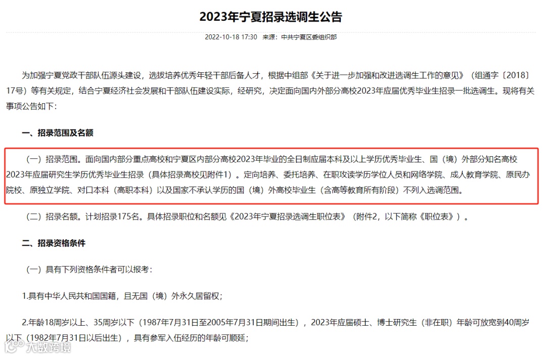 * 以下为宁夏2023选调信息,2024年信息暂未公布
