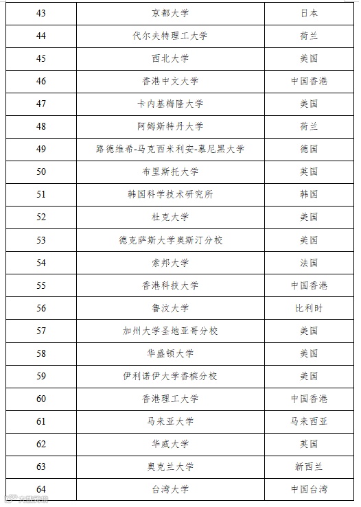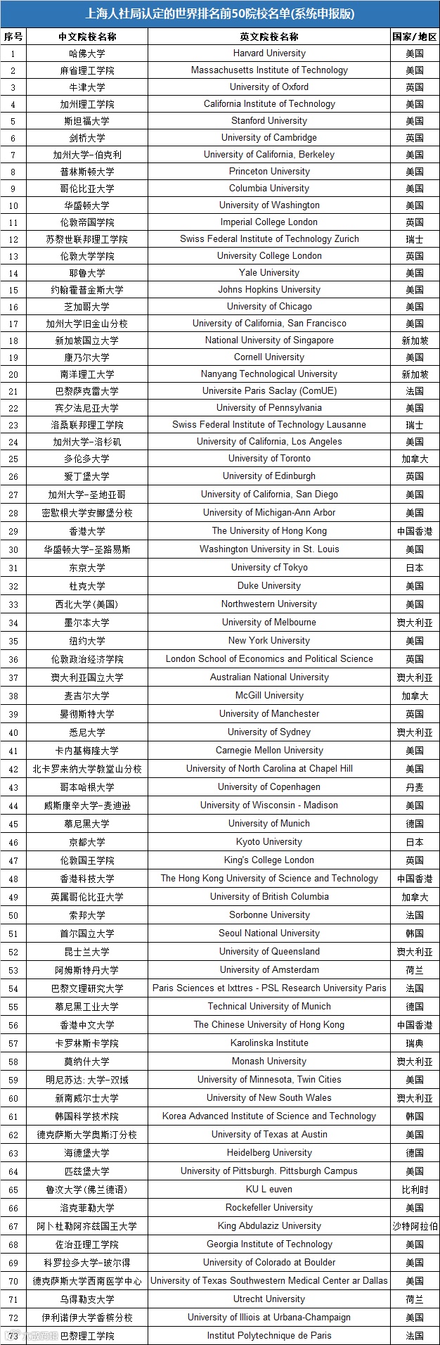 而上海公布,2023年留学生世界前50可直接落户上海。根据上海市人资系统认证,世界前50院校共有73所,名单如下:
