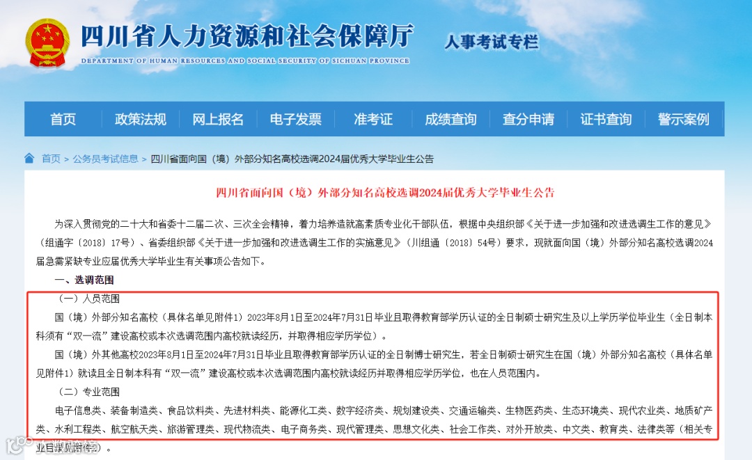 国(境)外其他高校2023年8月1日至2024年7月31日毕业且取得教育部学历认证的全日制博士研究生,若全日制硕士研究生在国(境)外部分知名高校(具体名单见附件1)就读且全日制本科有“双一流”建设高校或本次选调范围内高校就读经历并取得相应学历学位,也在人员范围内