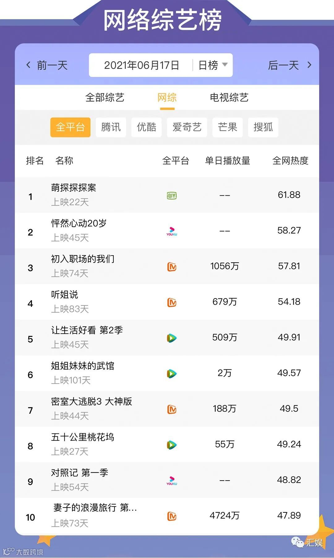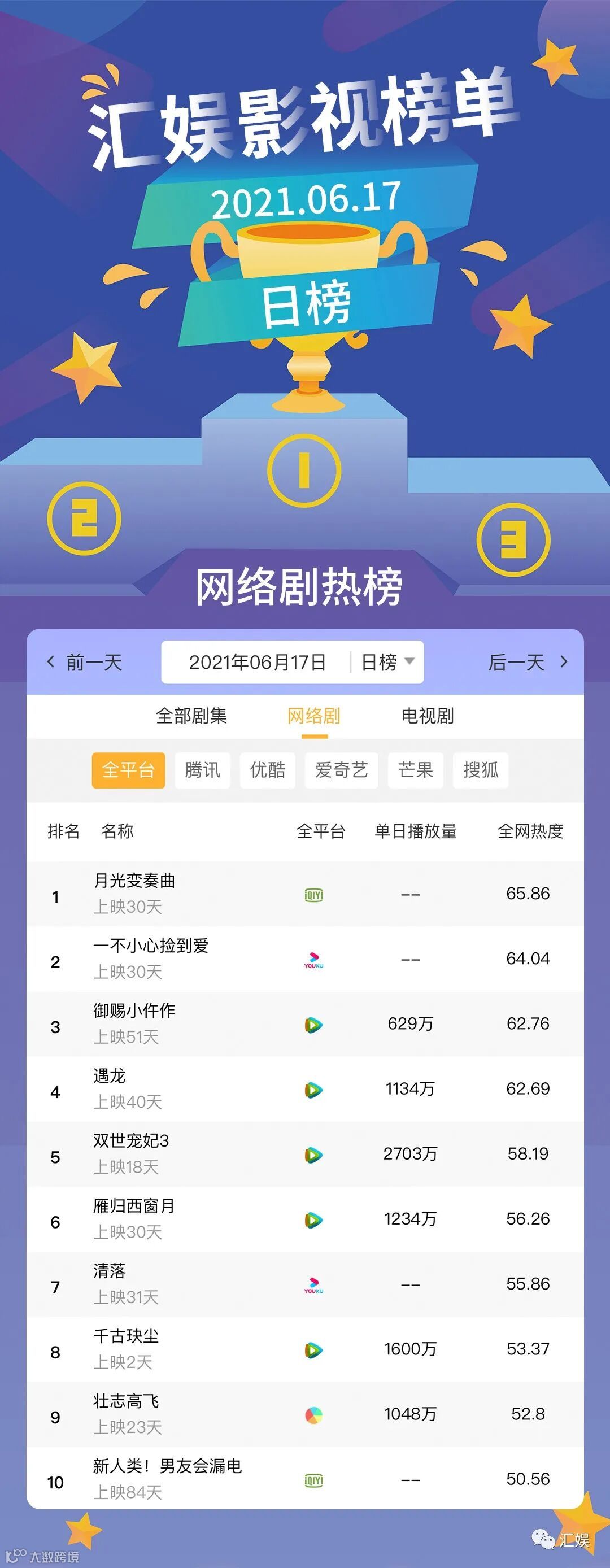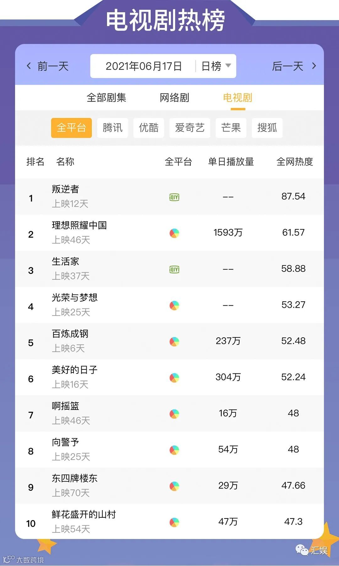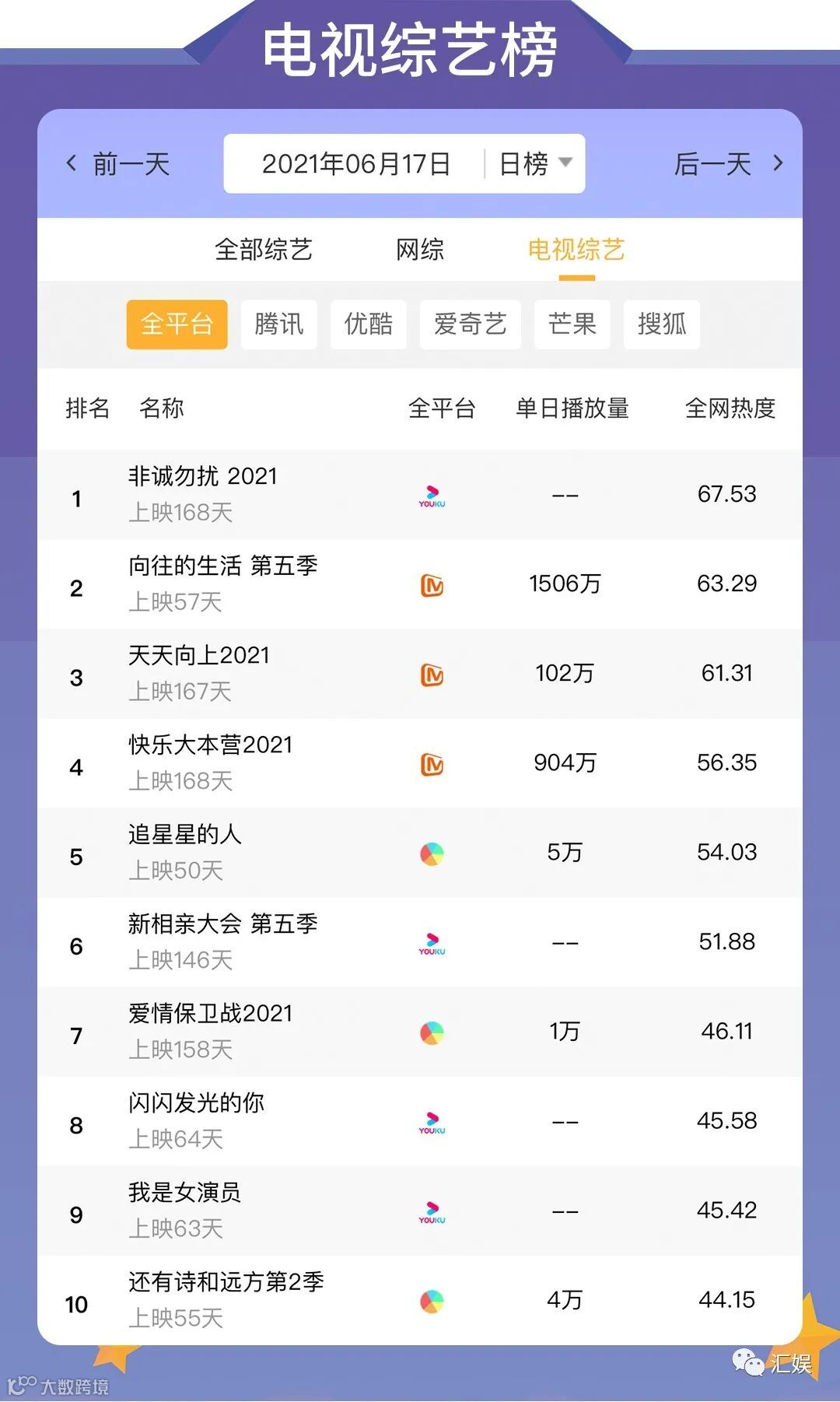 汇娱数据 | 2021.06.17 影视、综艺、艺人全网平台热度指数
