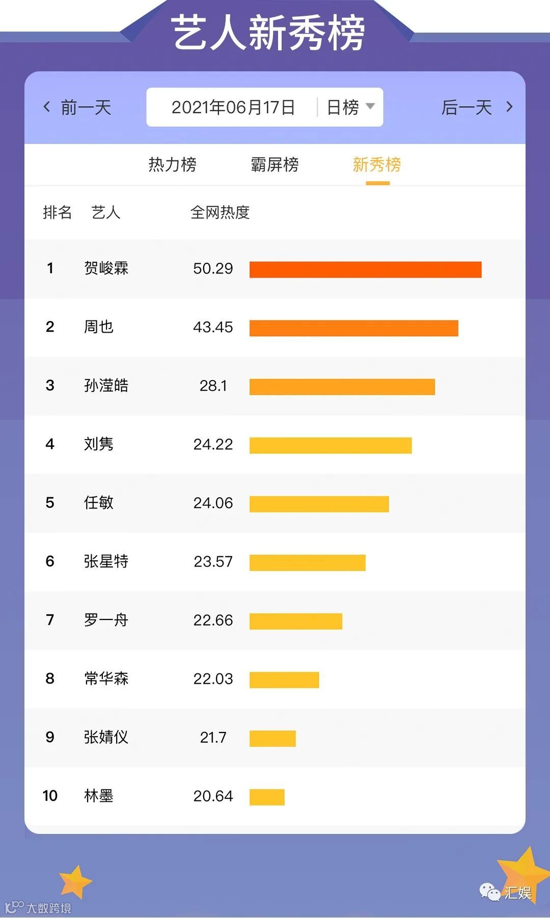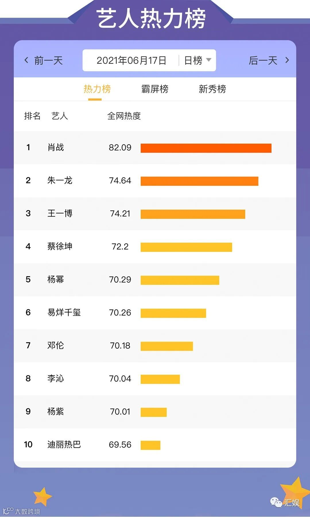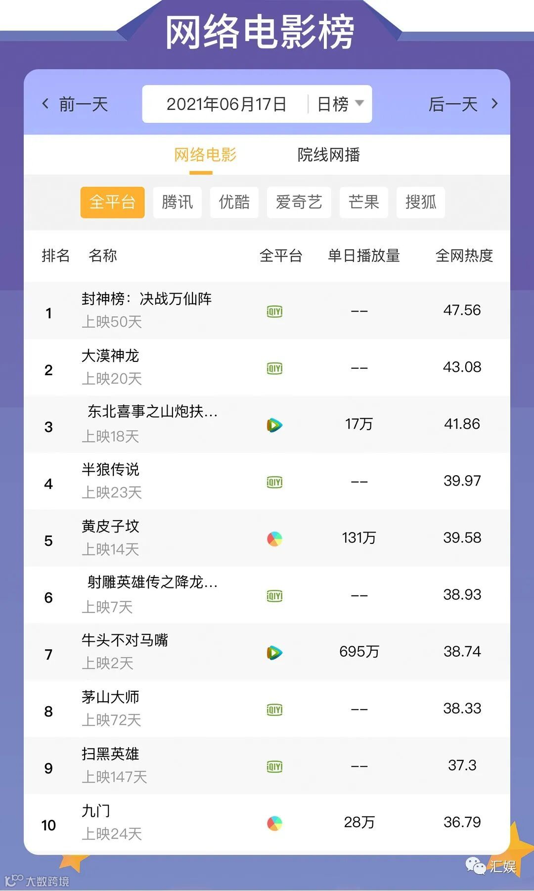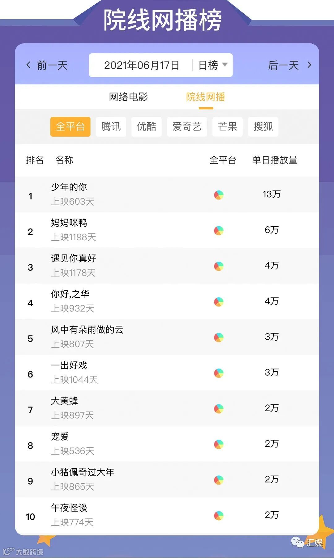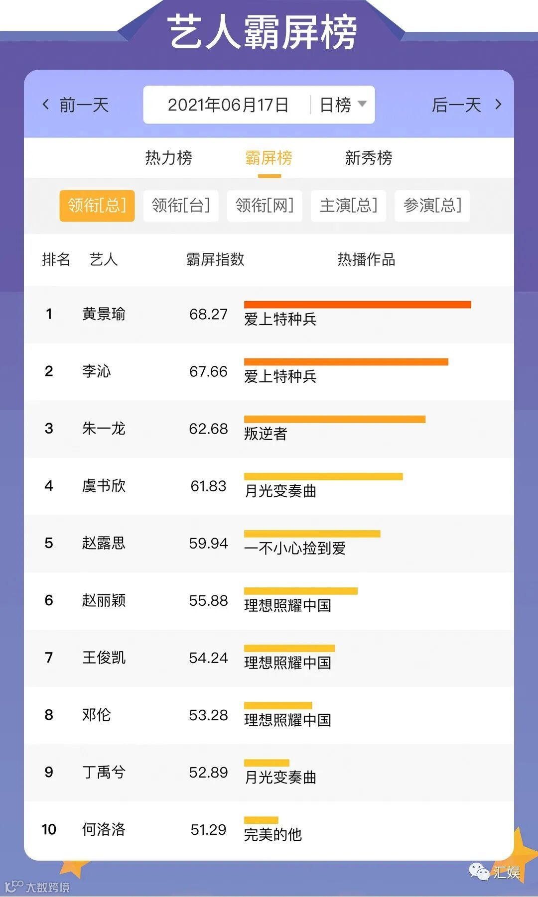 汇娱数据 | 2021.06.17 影视、综艺、艺人全网平台热度指数