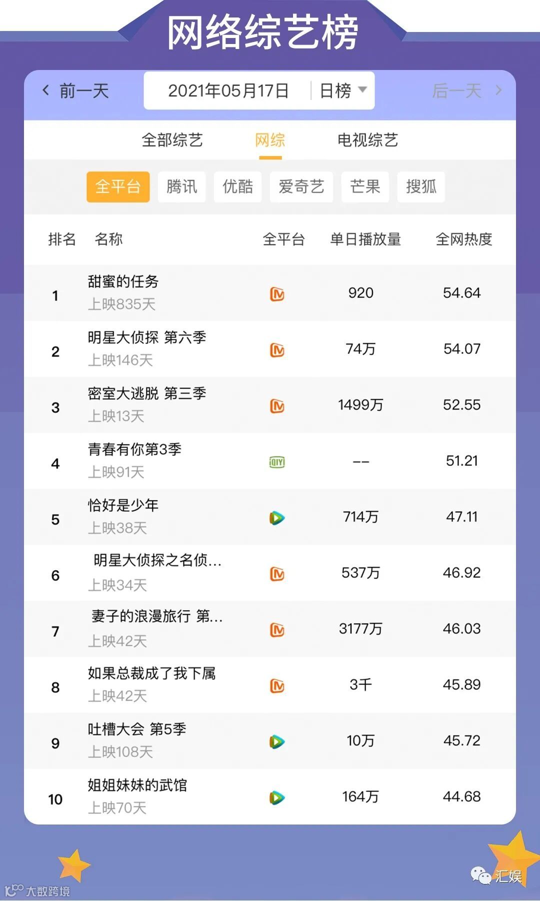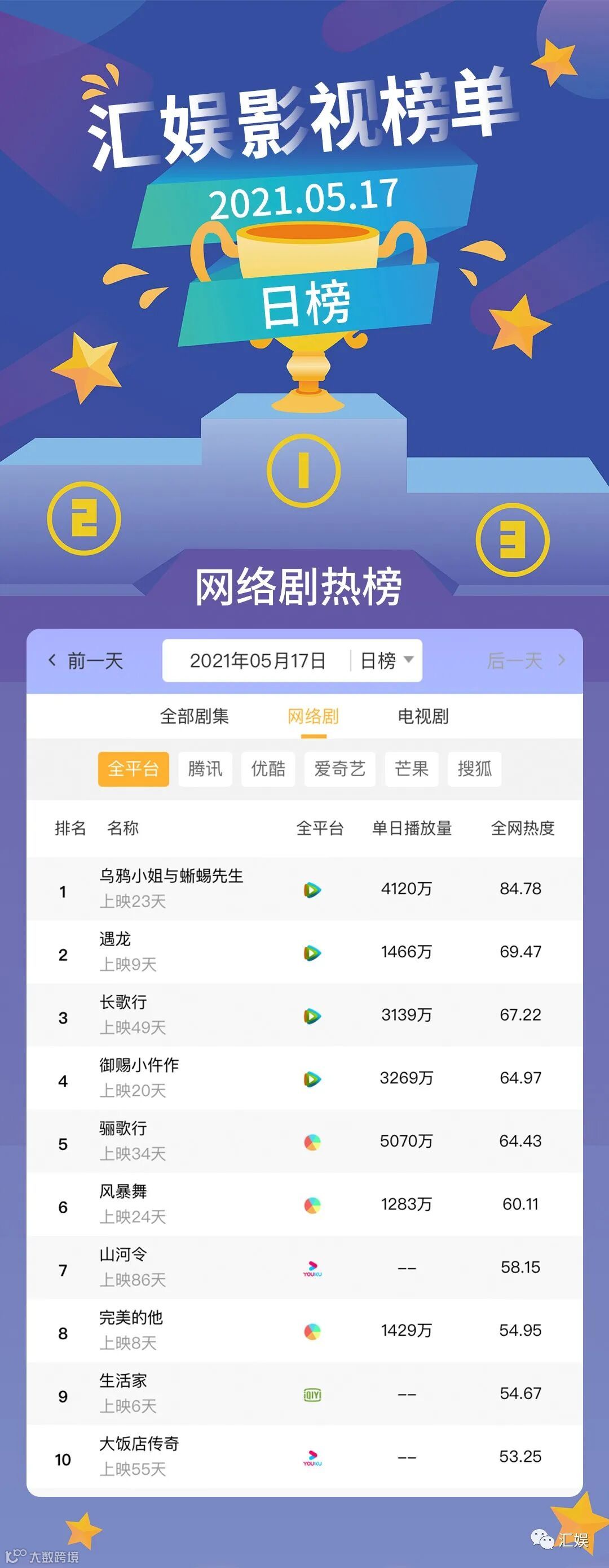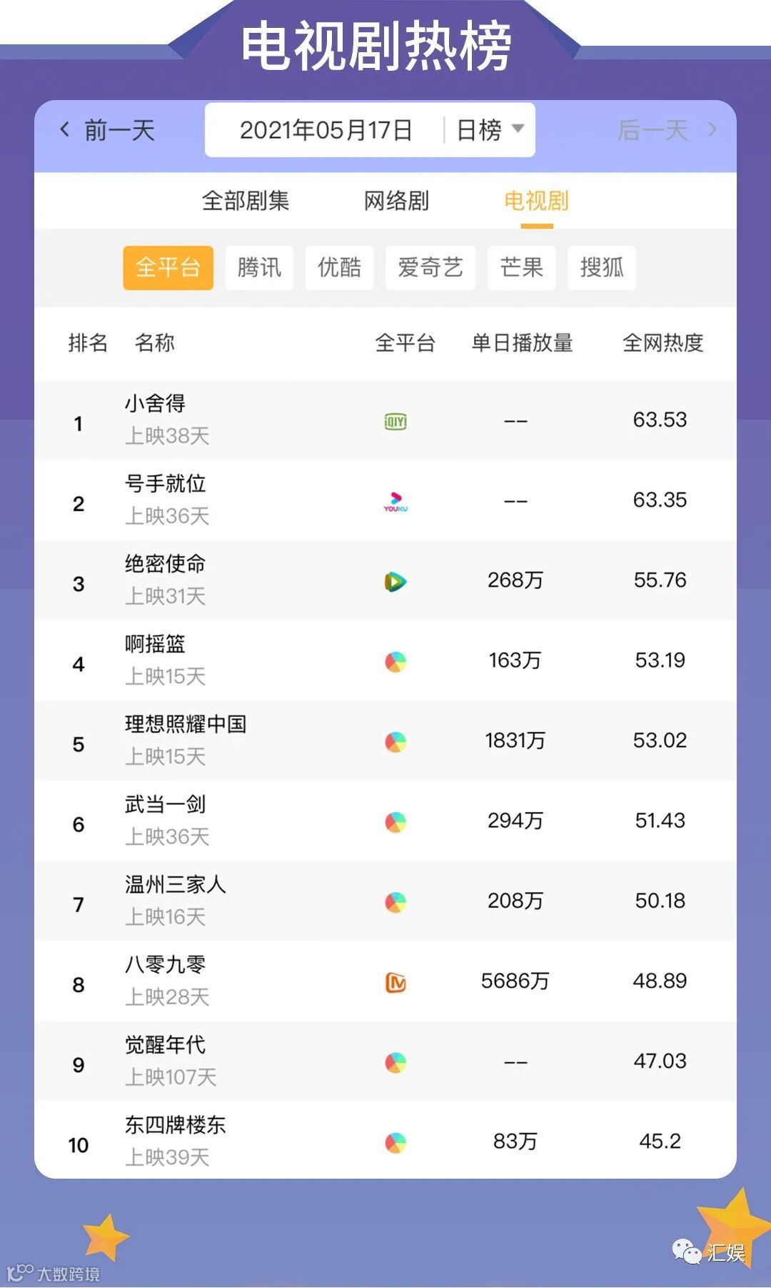 汇娱数据 | 2021.05.17 剧集、综艺、艺人全网平台热度指数